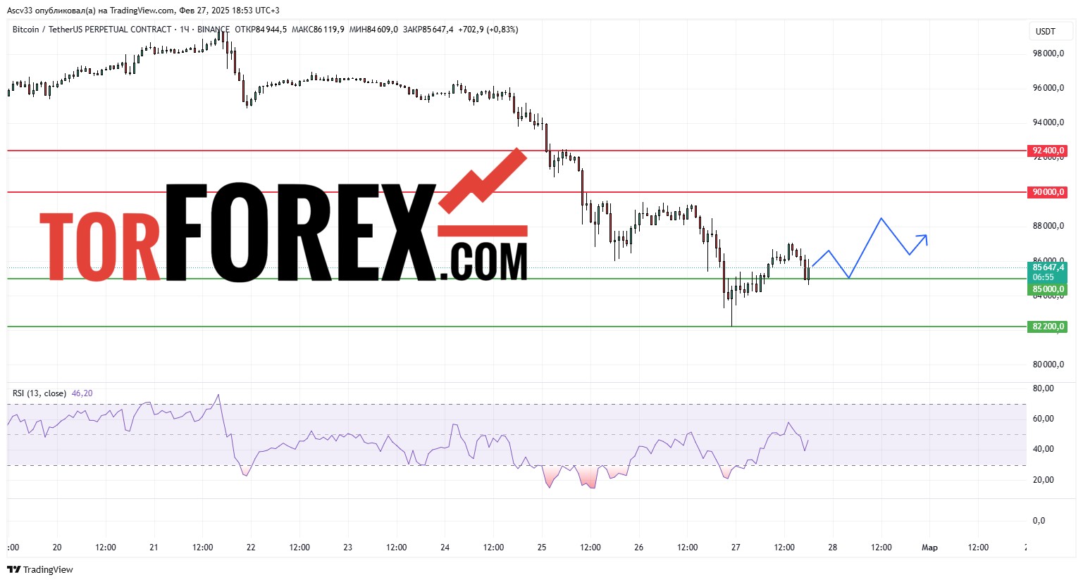 - Уровни поддержки: $85,000, $82,200