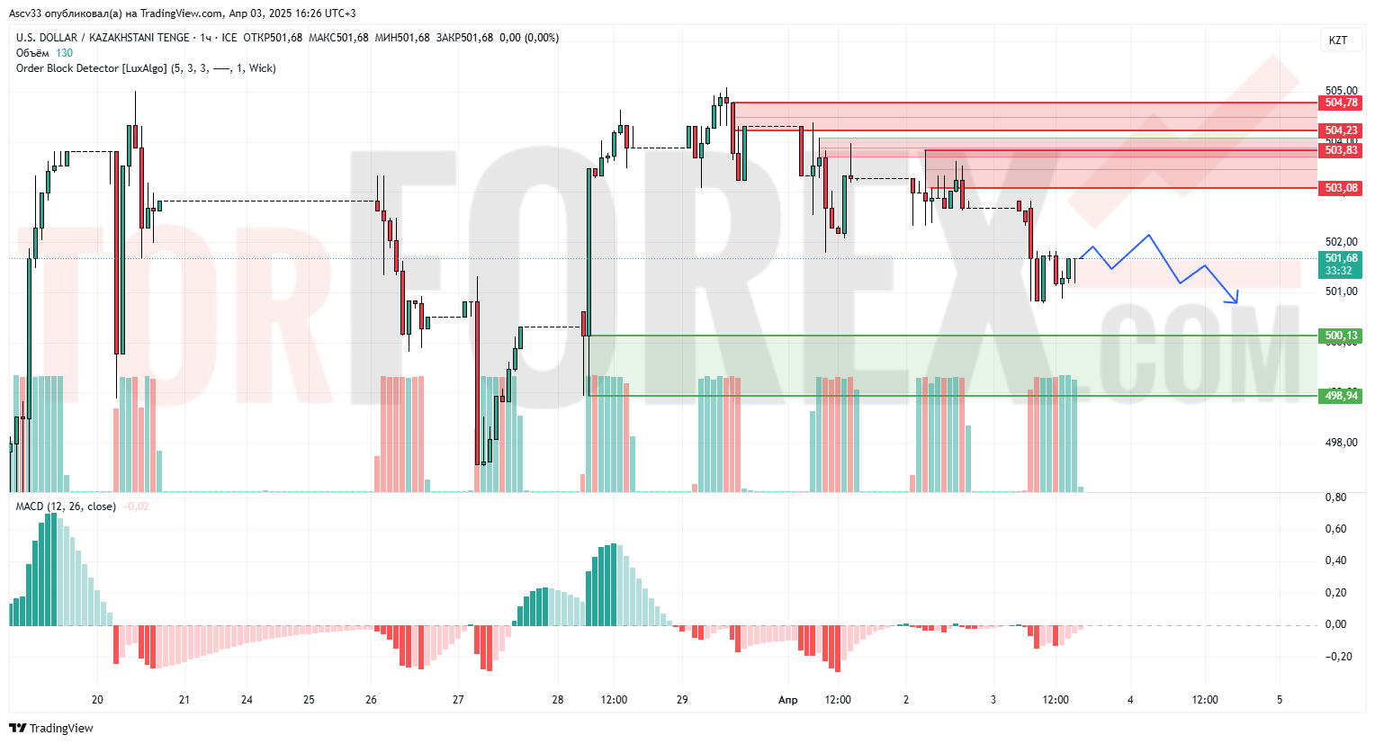 На часовом графике валютная пара USD/KZT демонстрирует признаки локальной слабости после неоднократных неудачных попыток пробоя зоны сопротивления 503,00–504,20. Цена закрепляется ниже этой области и продолжает колебаться в узком диапазоне, намекая на возможное снижение.