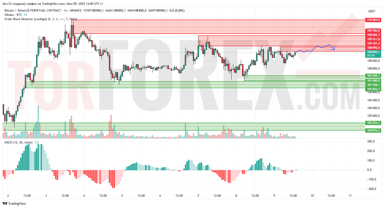 Ожидается движение в диапазоне 108400–109200 с возможными попытками пробоя вверх. При отскоке от зоны 109000–109200 вероятна краткосрочная коррекция к 108000. Сценарий — нейтральный с возможным импульсом после выхода из зоны консолидации.