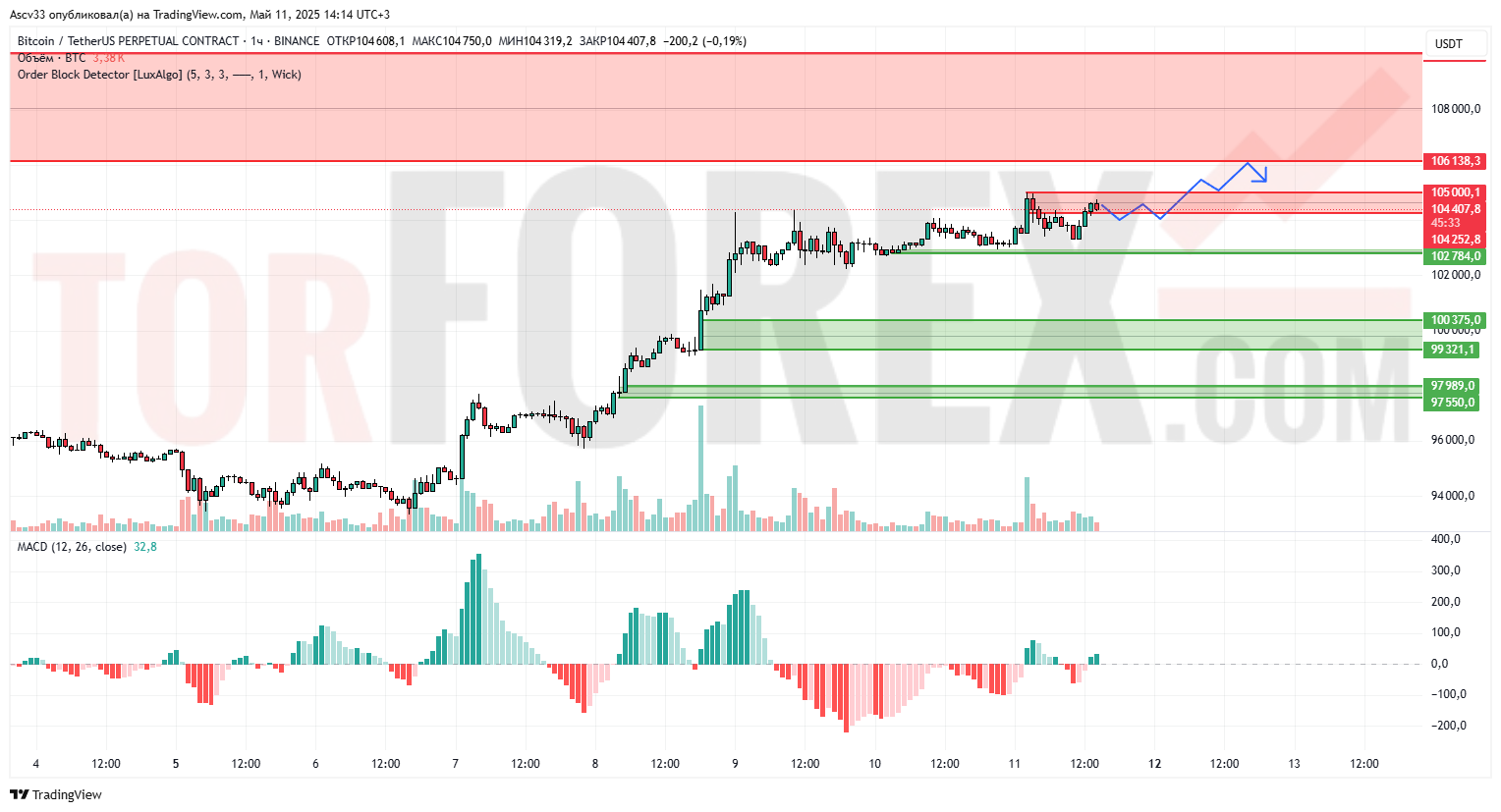Биткоин торгуется вблизи круглого уровня 105 000, находясь в фазе тестирования ключевого сопротивления. После роста с зоны 97 500–98 000 цена вошла в фазу консолидации, формируя потенциальный импульс вверх. MACD демонстрирует признаки восстановления, а объёмы немного снизились, что указывает на ожидание рынка.