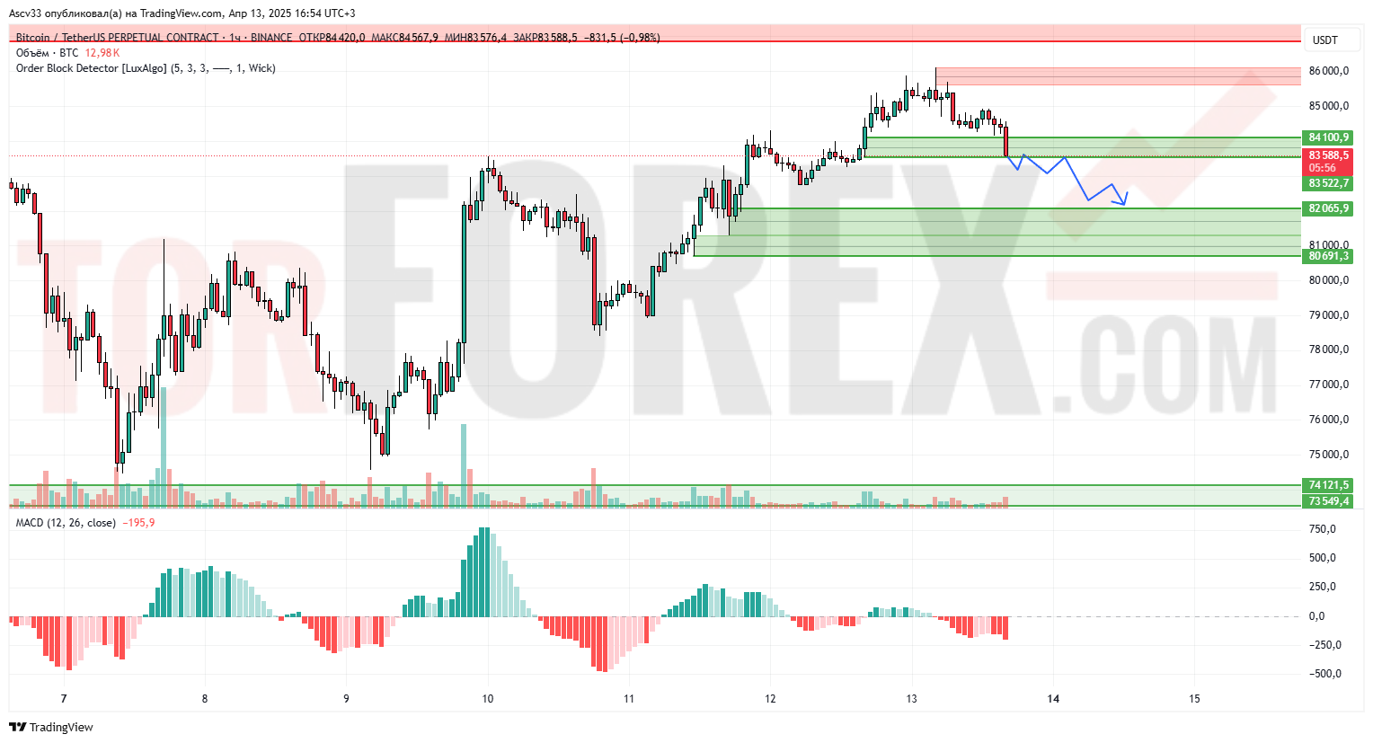 Bitcoin, скорее всего, продолжит нисходящее движение в направлении зоны $82,000–$80,700. При формировании разворотной свечной модели там можно ожидать отскок. Если зона не удержит цену — падение может продолжиться к $74,000.