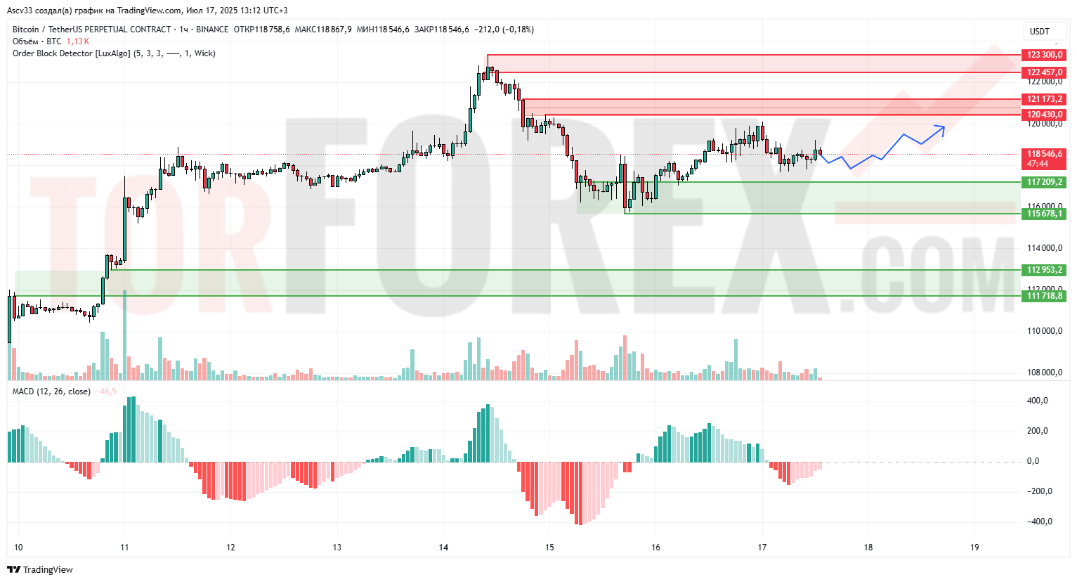 Биткоин консолидируется в боковом диапазоне после недавнего отскока от уровня 117 200. Нисходящее давление ослабло, и цена постепенно формирует более высокие минимумы. Объёмы торгов умеренные, что указывает на осторожность со стороны участников. Общая структура графика сохраняет потенциал для продолжения роста, если быки удержат текущие уровни.