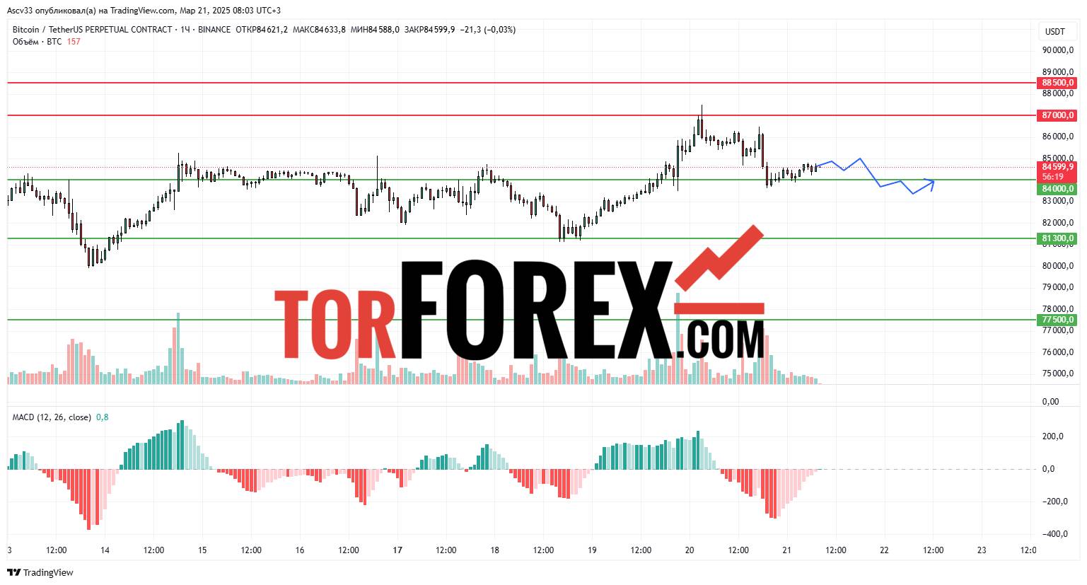 В ближайшие сутки ожидается, что BTC/USD будет колебаться в диапазоне 84,000–87,000 USD. Пробой 87,000 USD вверх подтвердит восходящее движение, в то время как закрепление ниже 84,000 USD усилит нисходящий тренд. Трейдерам стоит внимательно следить за поведением курса вблизи этих ключевых уровней, так как их прорыв может определить последующие шаги на рынке.