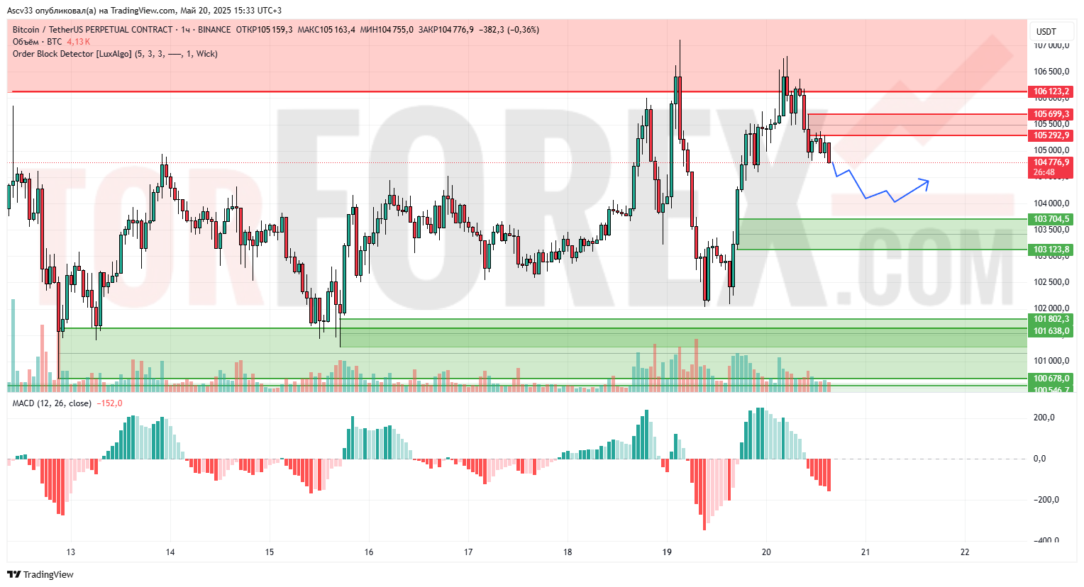 Ожидается снижение в диапазон 103 700–103 000 с вероятной консолидацией. Пробой ниже 103 000 может привести к тесту 101 800. Для возобновления роста потребуется восстановление выше 105 000 с объёмом и подтверждением по индикаторам. Текущая фаза остаётся коррекционной.