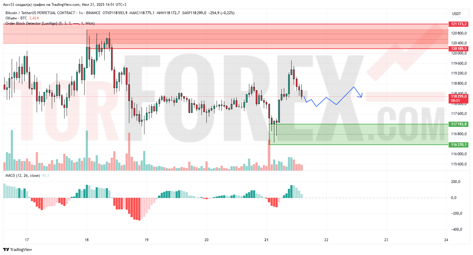 После неудачного теста зоны сопротивления 120 190–121 173 цена биткоина резко отскочила вниз и закрепилась ниже 118 400. Это свидетельствует о присутствии продавца вблизи ключевого уровня предложения. Структура движения показывает формирование локального боковика, и попытки роста пока не приводят к устойчивому пробою.