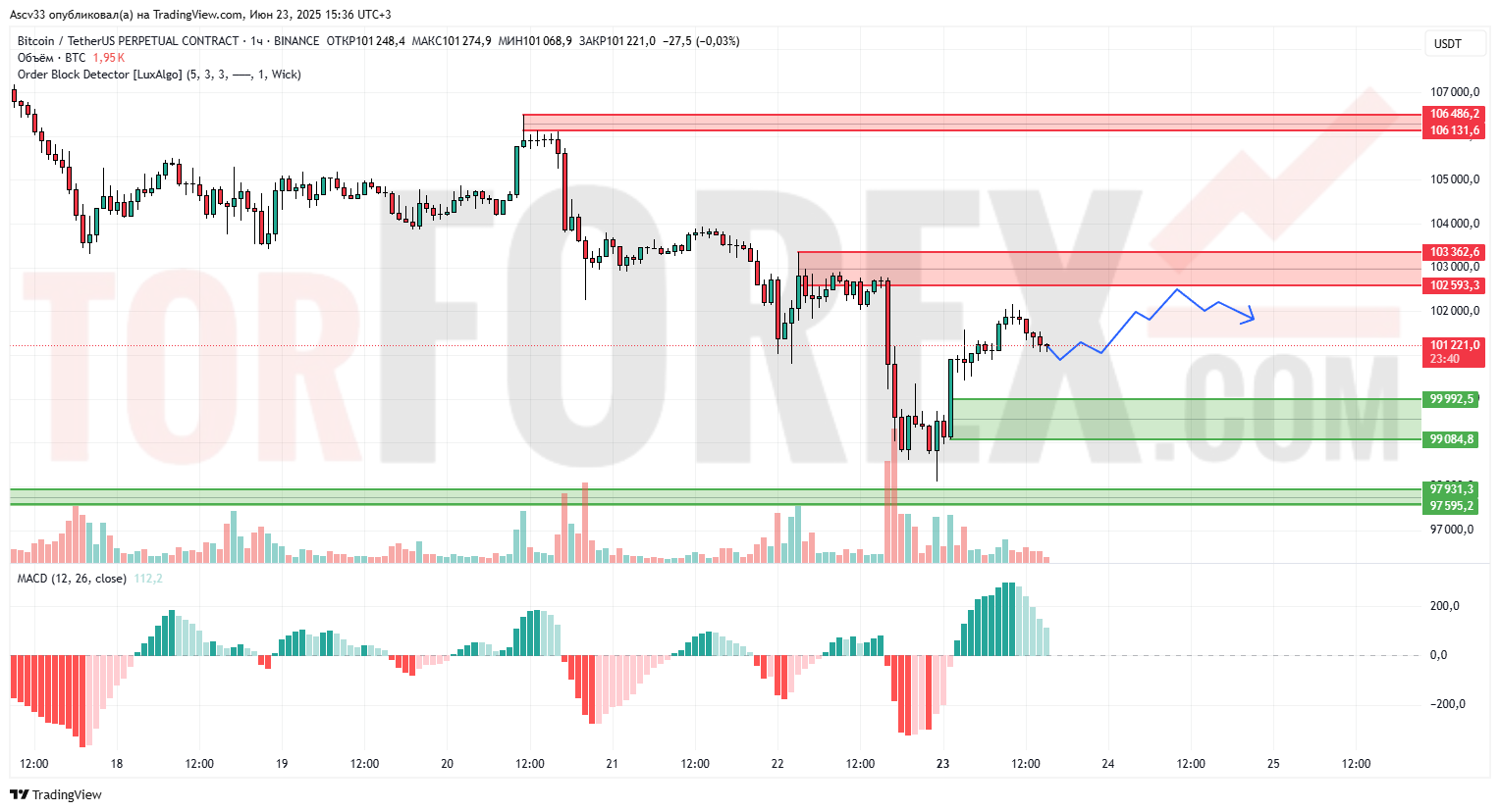 Биткоин консолидируется после отскока от уровня поддержки в районе 99,000. Импульс вверх сопровождался всплеском объёмов, что указывает на покупательский интерес. Однако вблизи уровня 102,000 цена встретила сопротивление. Индикатор MACD находится в положительной зоне, указывая на краткосрочное преобладание быков, но с признаками замедления.