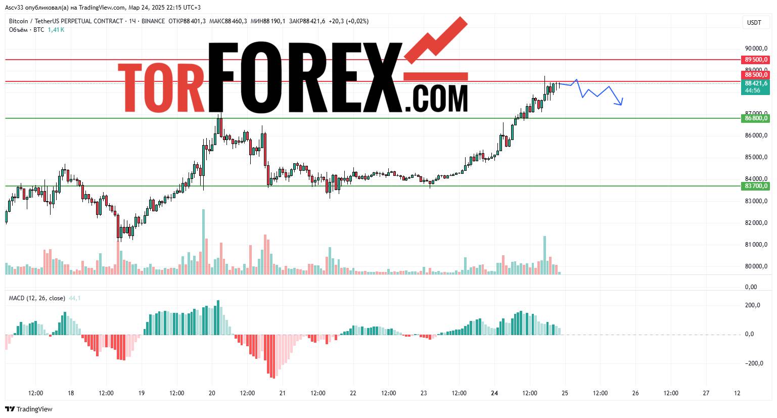 - 88,500 USD – преодоление этого уровня может поддержать бычьи настроения и привести к дальнейшему росту до 89,500 USD.