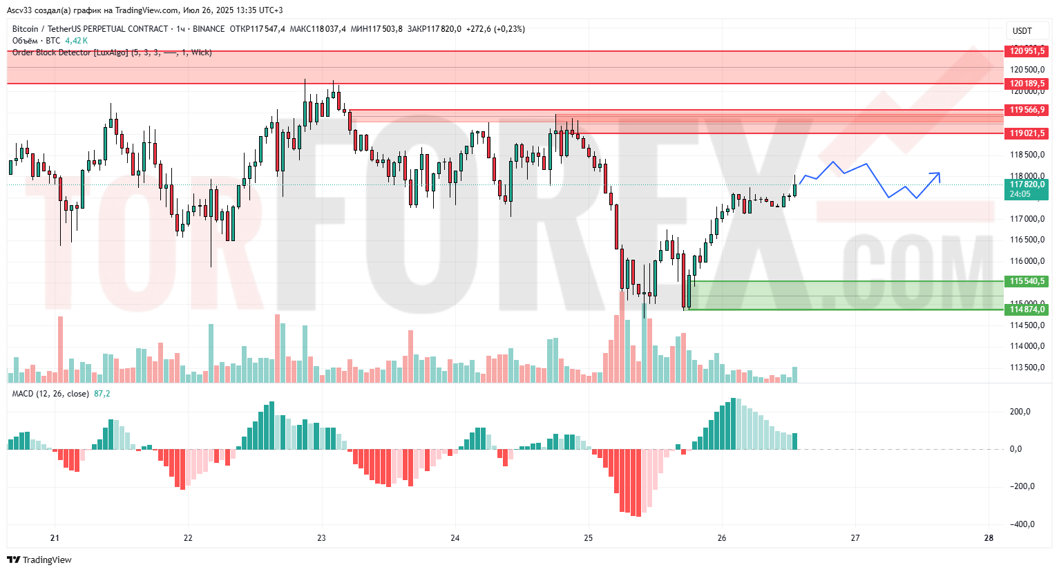 При удержании выше 117 000 пара BTC/USD имеет потенциал для продолжения восстановления в направлении 119 021 – 119 566. Успешный пробой этой зоны откроет путь к следующим уровням сопротивления. Однако, следует быть внимательными к реакции цены на эти уровни, так как они могут вызвать коррекцию. Основным сценарием остается продолжение восходящего движения в рамках текущей коррекции.