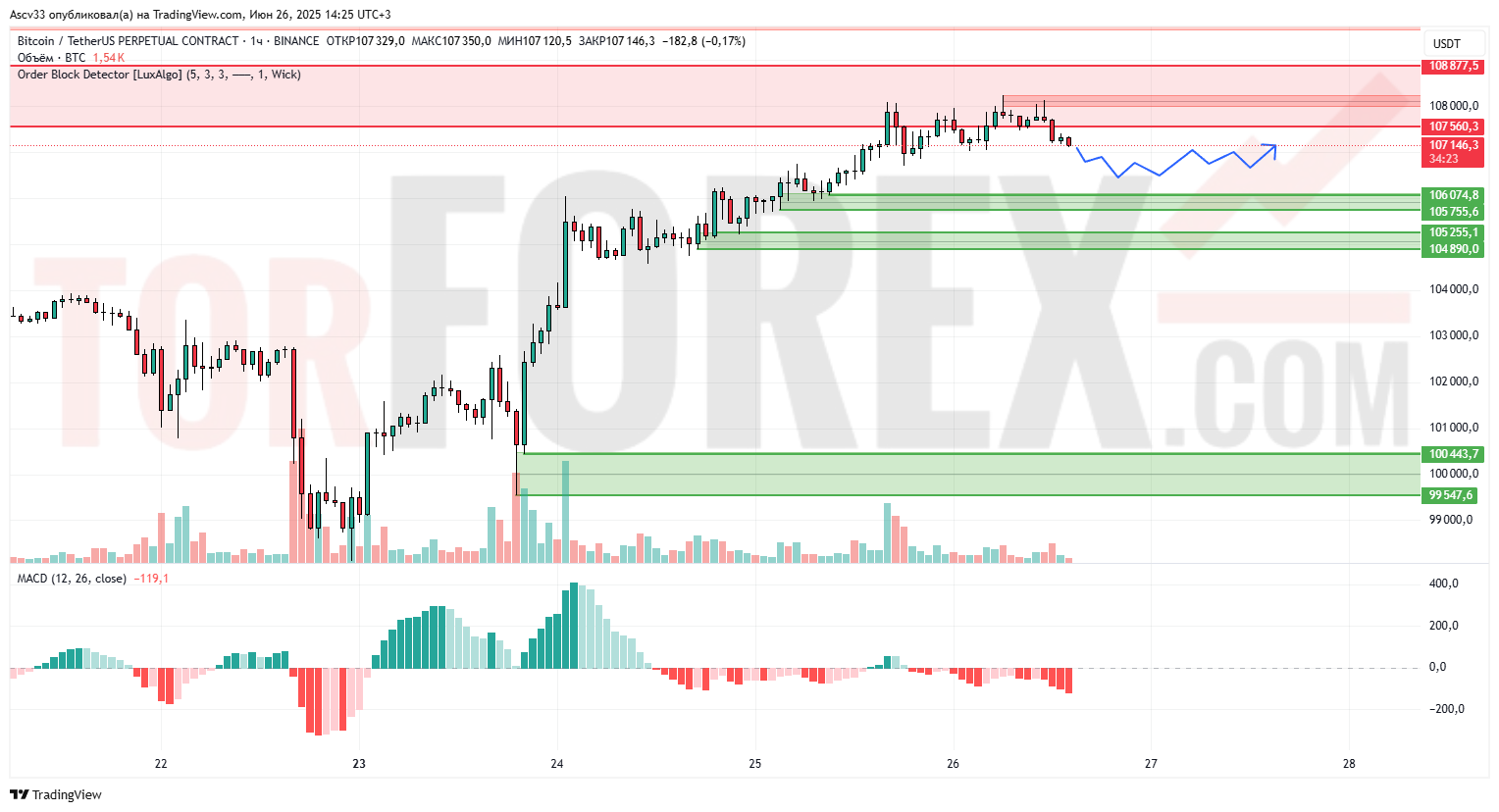107560–108877,5 — локальная зона продавцов, от которой BTC откатывает. Пробой вверх подтвердит силу быков и откроет путь к 110000.