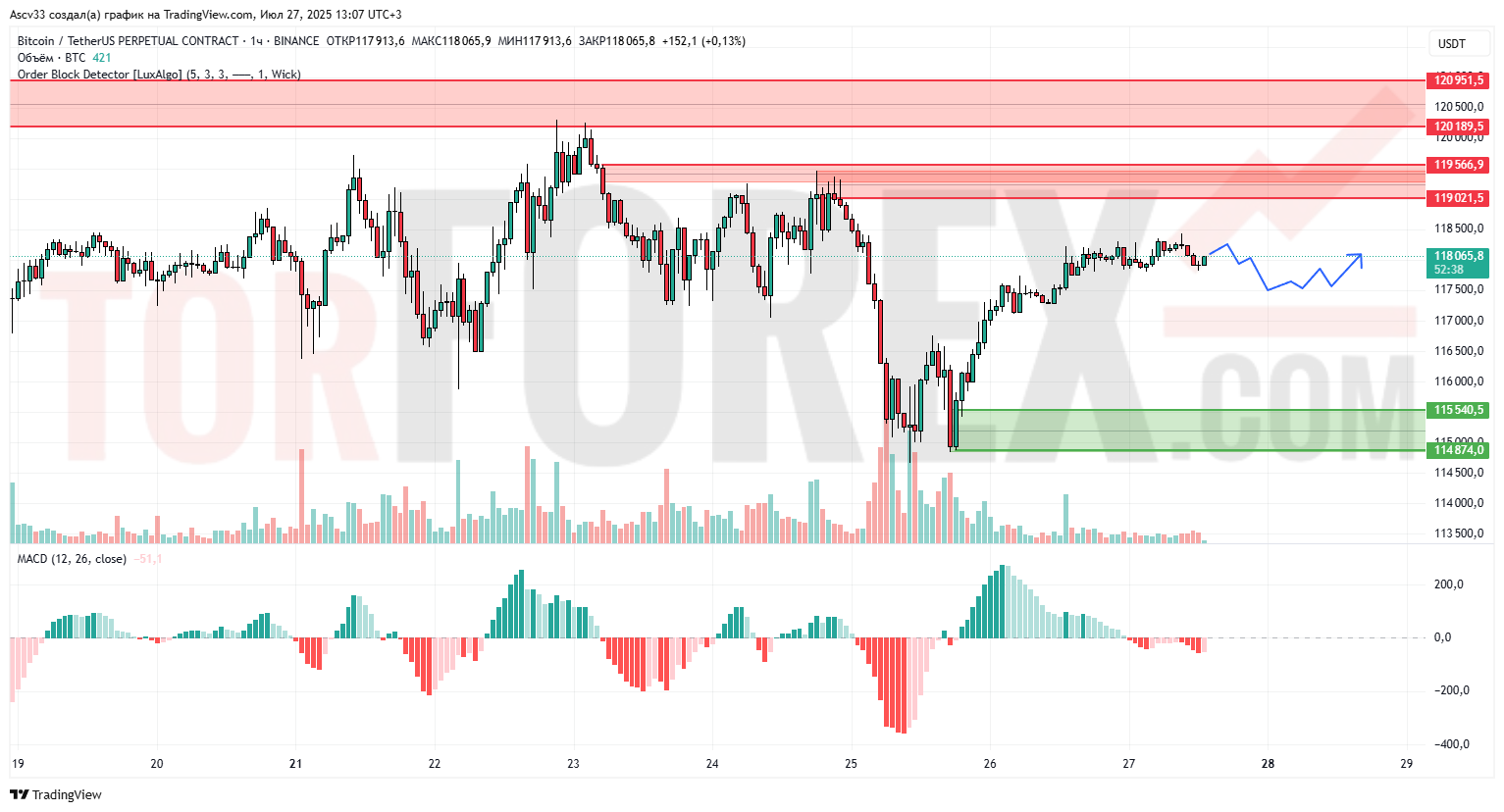 115 540.5 – 114 874.0 — эта область ранее продемонстрировала свою эффективность как сильная поддержка, вызвав текущий отскок. Она остается ключевой зоной для «быков».