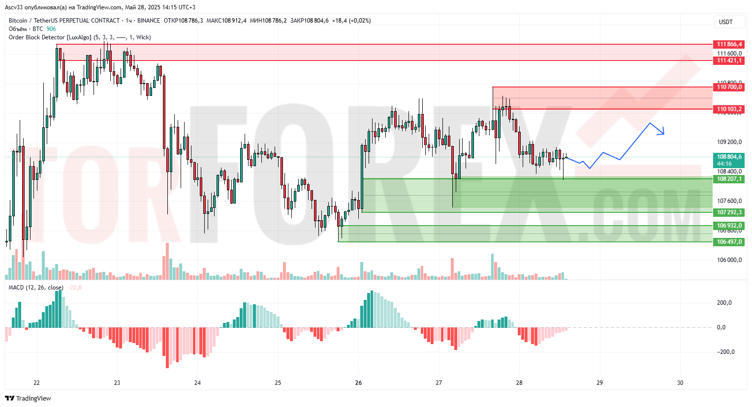 Биткоин находится в фазе консолидации после отката от зоны предложения 110 100–110 700. Цена удерживается над уровнем 108 200, где сформировалась устойчивая поддержка. Наблюдается сужение волатильности и снижение объёмов, что подтверждает фазу накопления. MACD демонстрирует ослабление медвежьего импульса, гистограмма приближается к нулю.