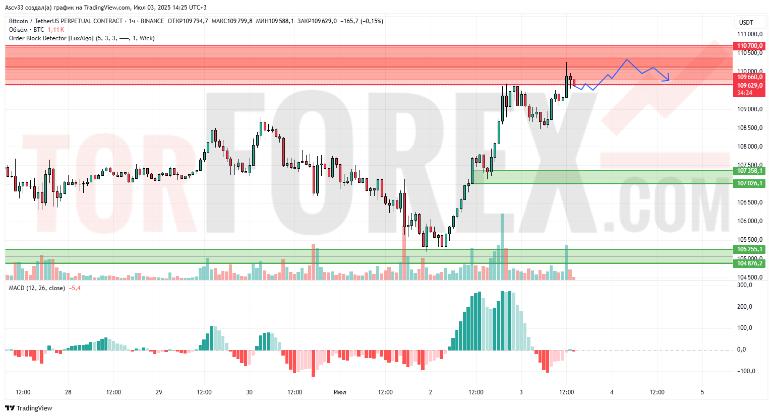 109660–110700 — активная зона предложения, в которой сосредоточены ордера на продажу. Здесь высок риск фиксации прибыли и коррекции вниз.