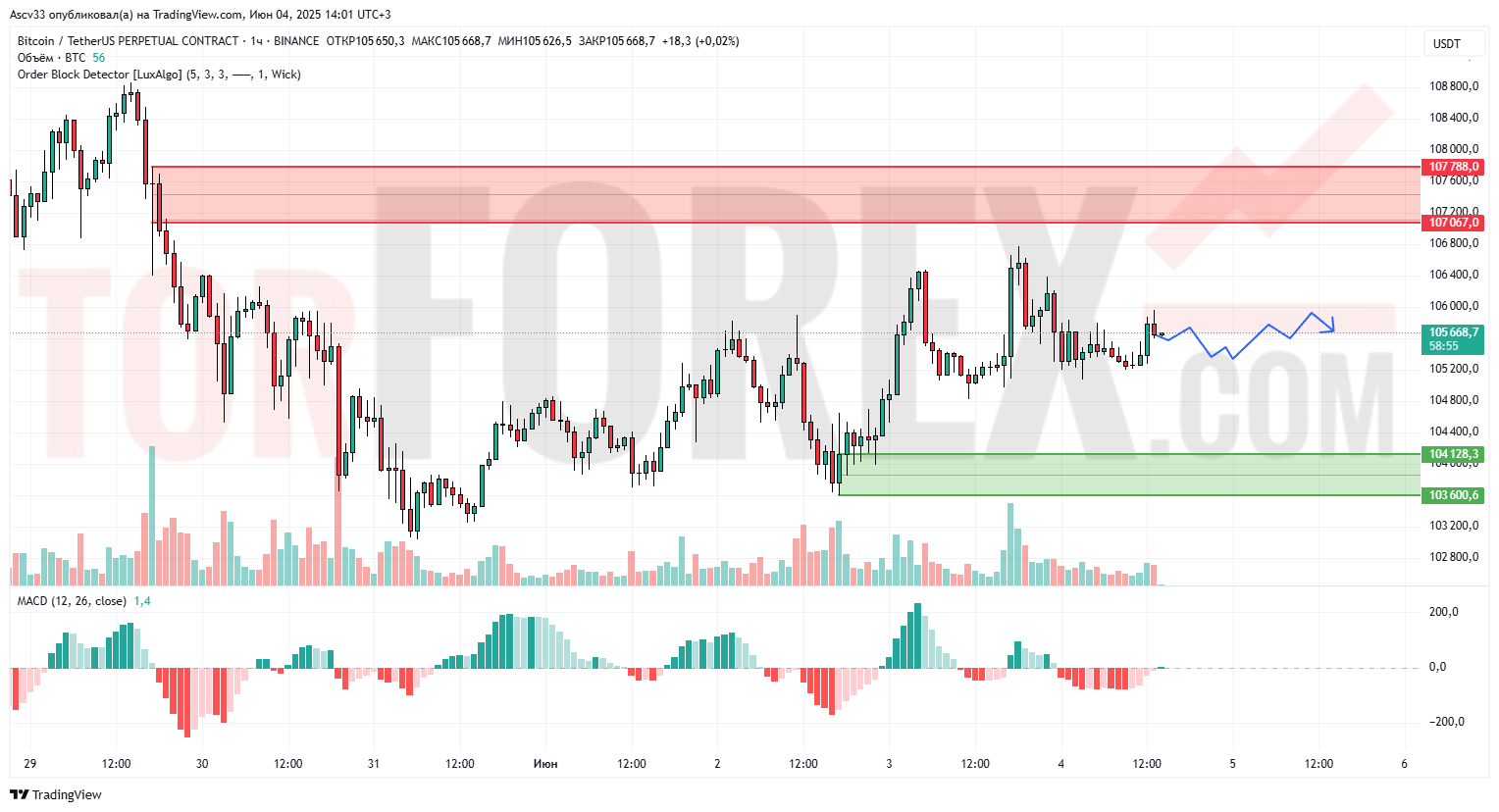 Ожидается боковое движение в диапазоне 105 200–106 000 с возможным выходом вверх при пробое 106 400. В случае снижения, поддержка на 104 100 может быть протестирована повторно.
