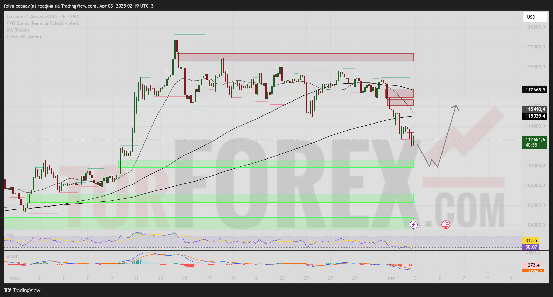 Шорт: в случае отскока к $115,000 – $117,000 и сигнала от MACD или Price Action