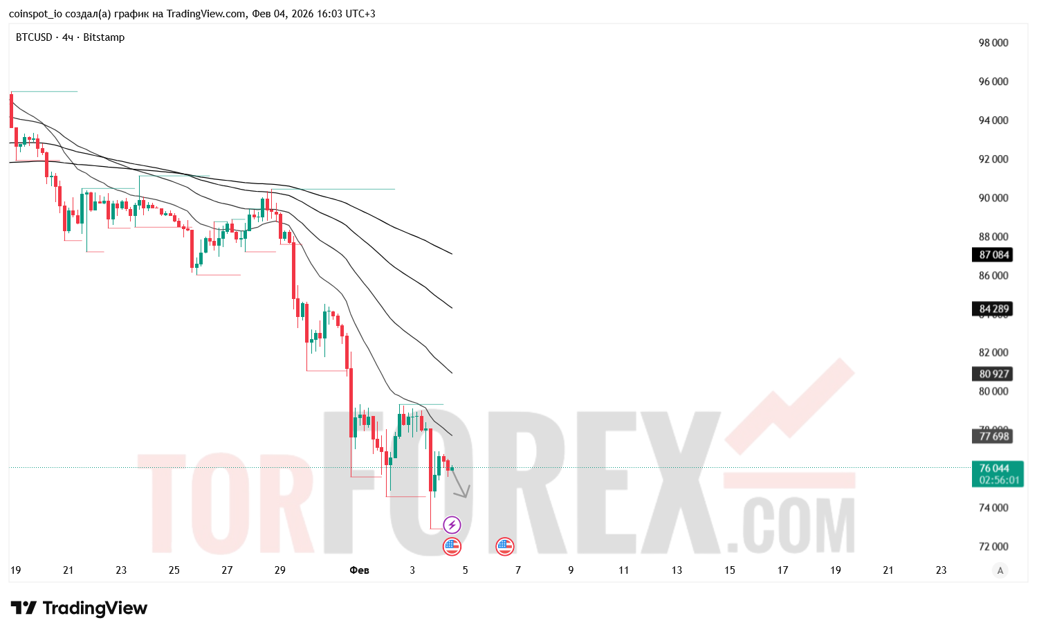 К началу торгового дня 5 февраля 2026 года пара BTC/USD остаётся под давлением продавцов, несмотря на локальный откат вверх. На 4‑часовом графике цена закрепилась в диапазоне 75 800–76 200 USD, формируя слабое восстановление после обновления локального минимума. Общая структура рынка остаётся медвежьей: нисходящий тренд сохраняется, а любые подъёмы выглядят как технические коррекции. Волатильность умеренная, но импульс продавцов остаётся доминирующим.