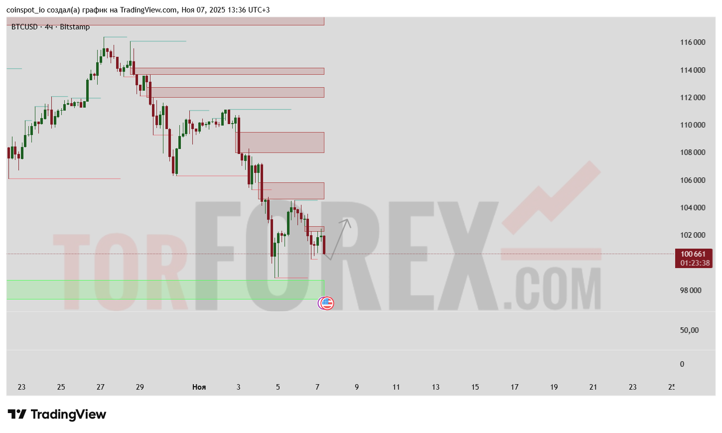 На 8 ноября 2025 года базовый сценарий остаётся нейтрально-бычьим. Торговая идея — поиск входа в лонг при удержании выше 100 200 с целями 101 800 и 103 000. Альтернативный сценарий — шорт при пробое 99 800 с целями 98 500 и 97 200.
