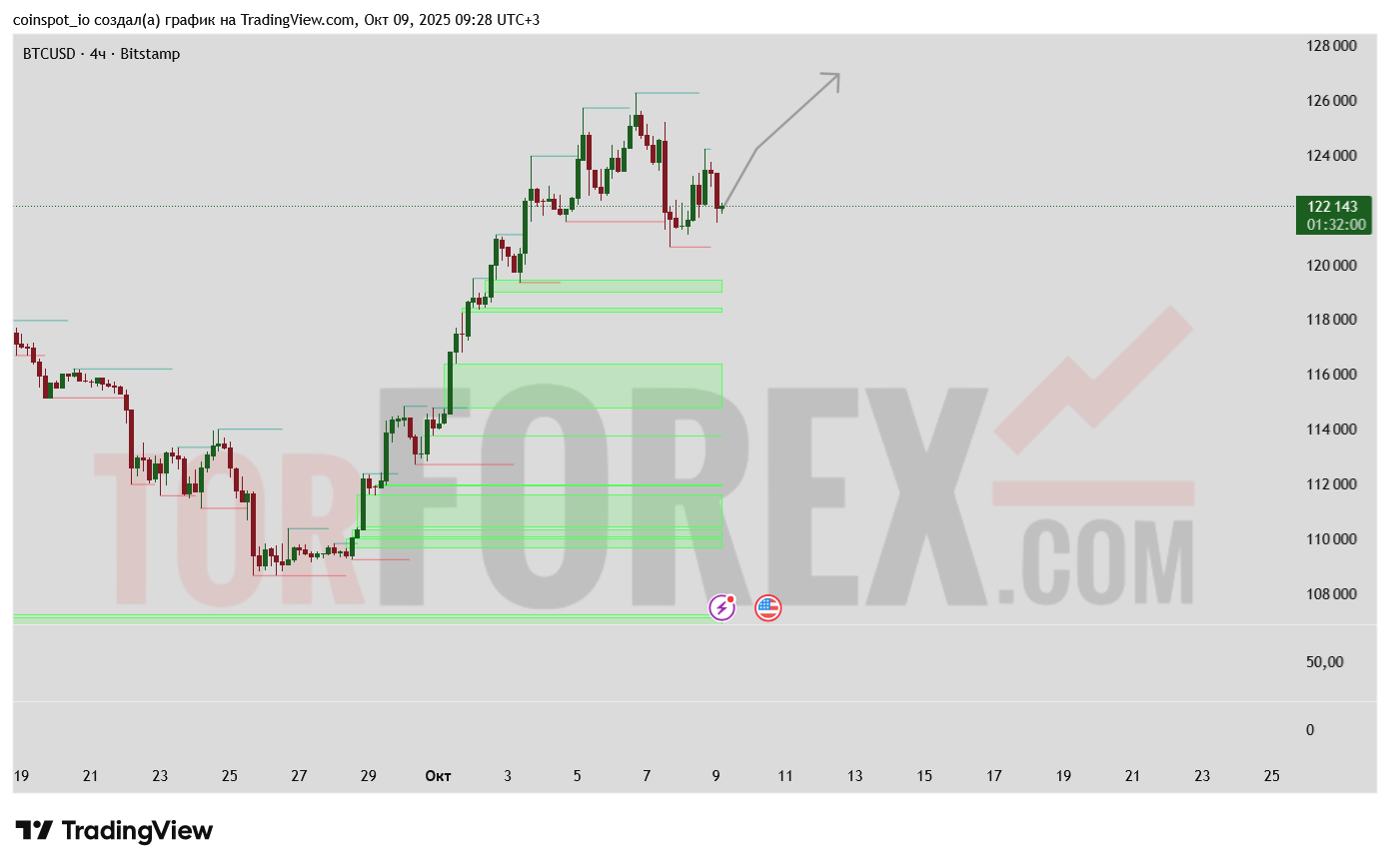 FVG Zones: На графике идентифицированы незаполненные зоны Fair Value Gap в диапазоне 118 000-119 000 USD. Эти области формируют потенциальный магнит для цены и могут выступить целью при развитии коррекционного сценария.