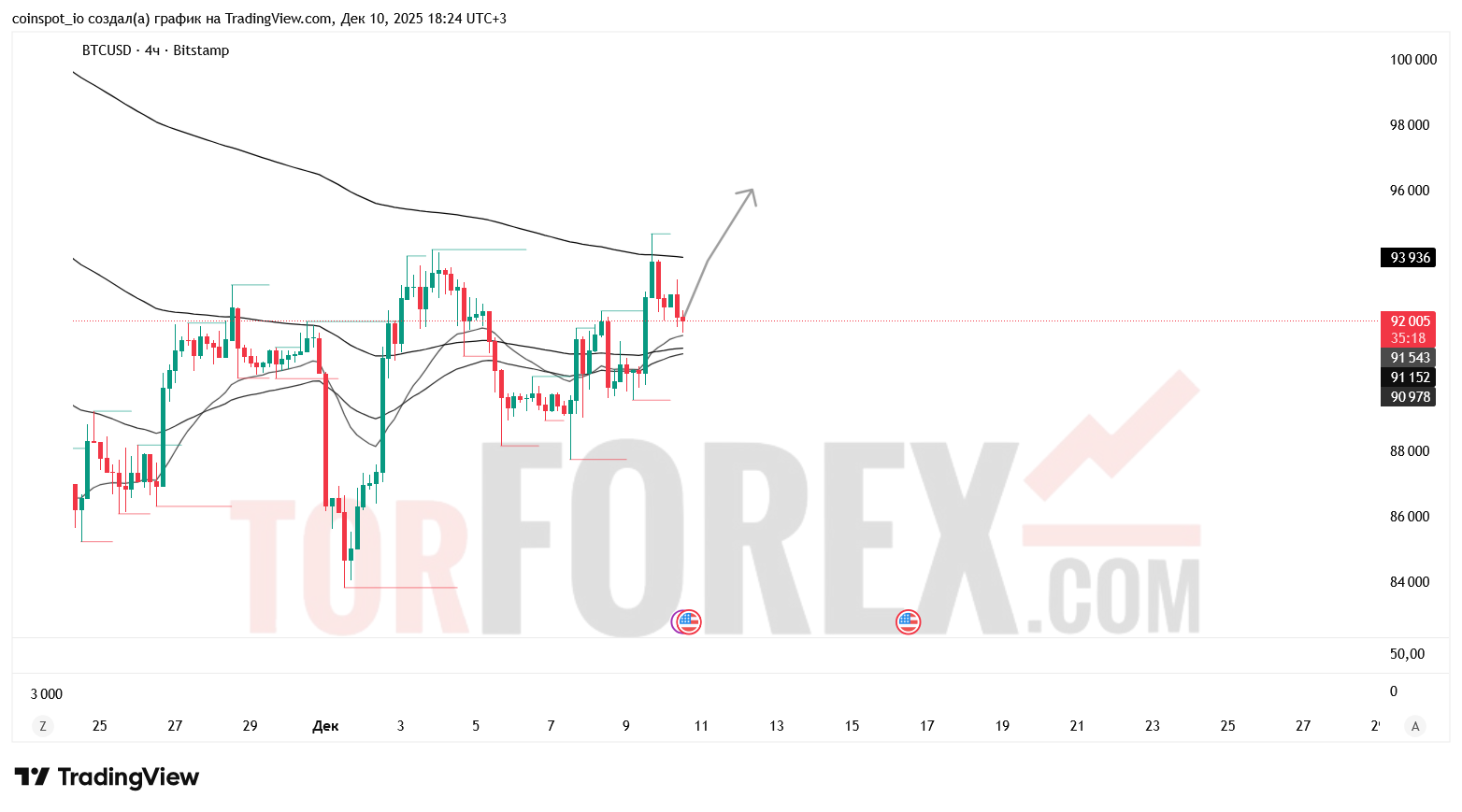 На 11 декабря 2025 года BTC/USD демонстрирует признаки консолидации. Основной сценарий — рост к 94 500–95 800 USD при пробое сопротивления. Альтернативный сценарий — снижение к 90 000–88 500 USD при отказе от уровня 93 937 USD.