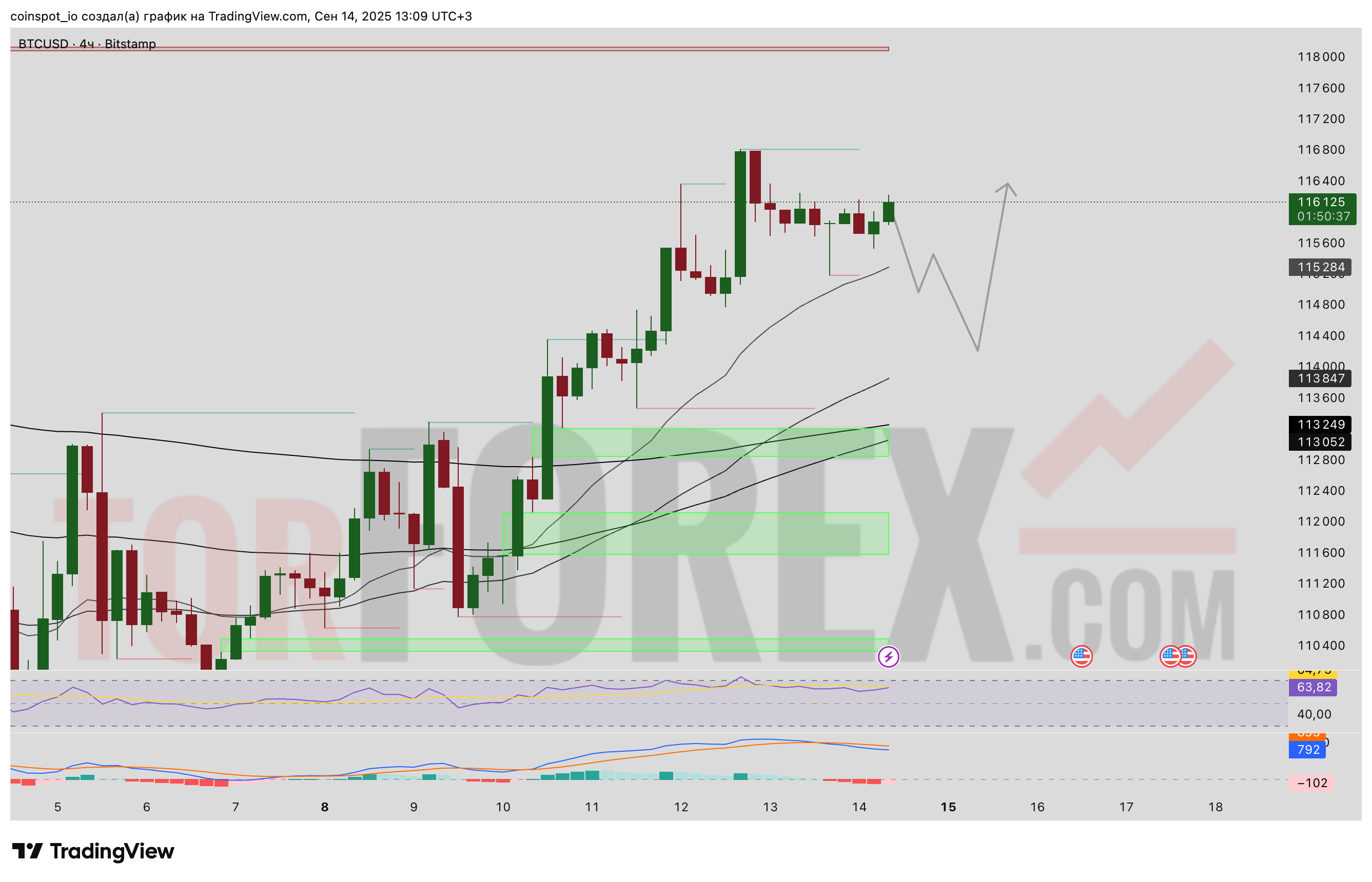 Коррекция возможна при пробое вниз уровня 115 600. В этом случае цена может вернуться к поддержкам 113 800–113 200. Потеря зоны 113 000 станет сигналом для более глубокой коррекции с целями у 111 500–112 000.