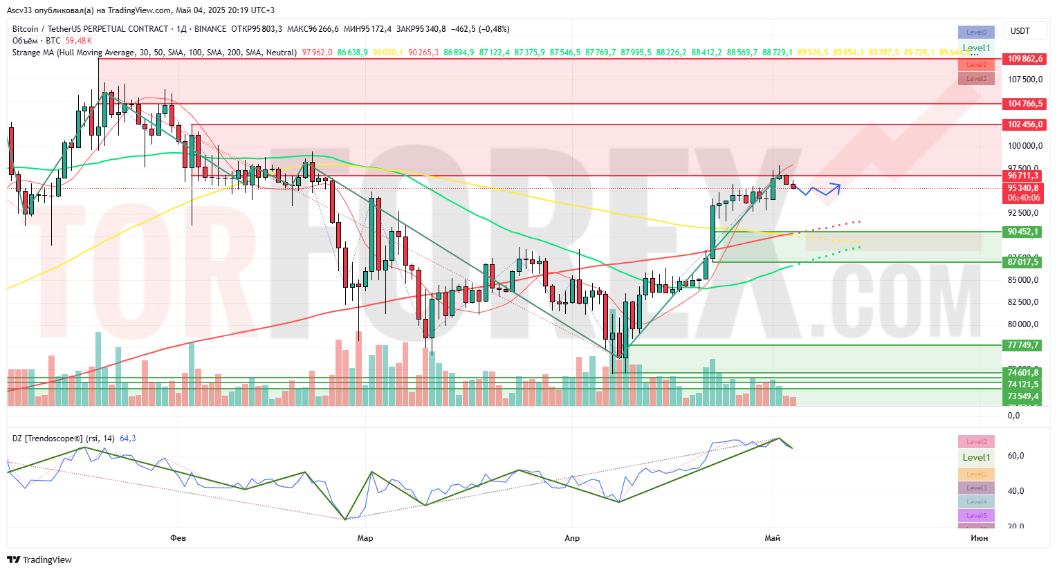 Цена BTC/USD завершила пятницу 3 мая на уровне $95 340, оставаясь ниже важного сопротивления в области $96 700–$97 500. Здесь сосредоточен мощный медвежий Order Block, совпадающий с предыдущими уровнями разворота, что делает зону критически важной для дальнейшего движения.