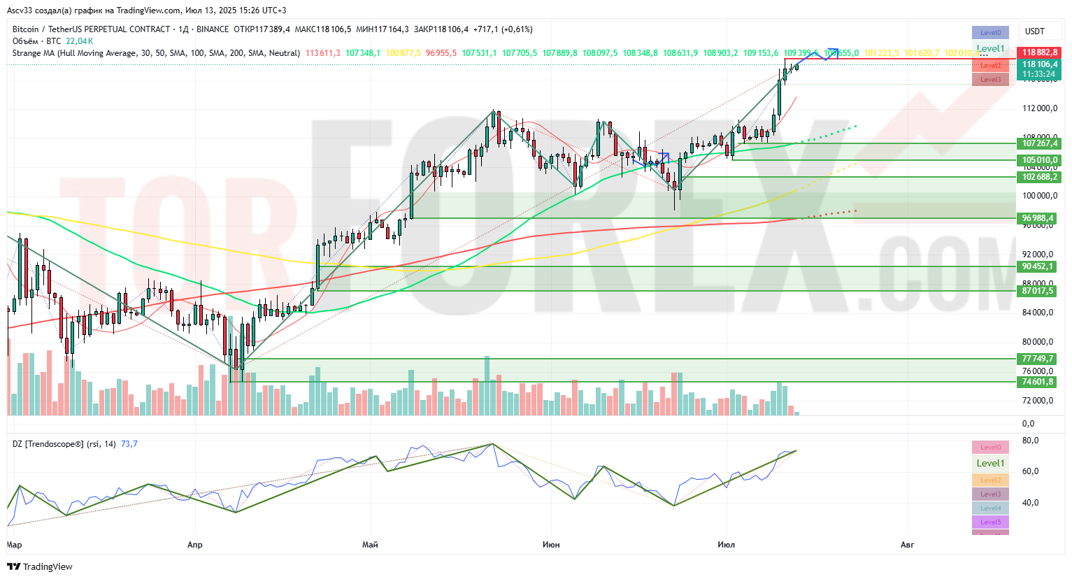 При пробое и закреплении выше $119 000 может последовать движение к новому максимуму — $122 000–$125 000. Однако для этого потребуется усиление объёмов и подтверждение со стороны RSI.