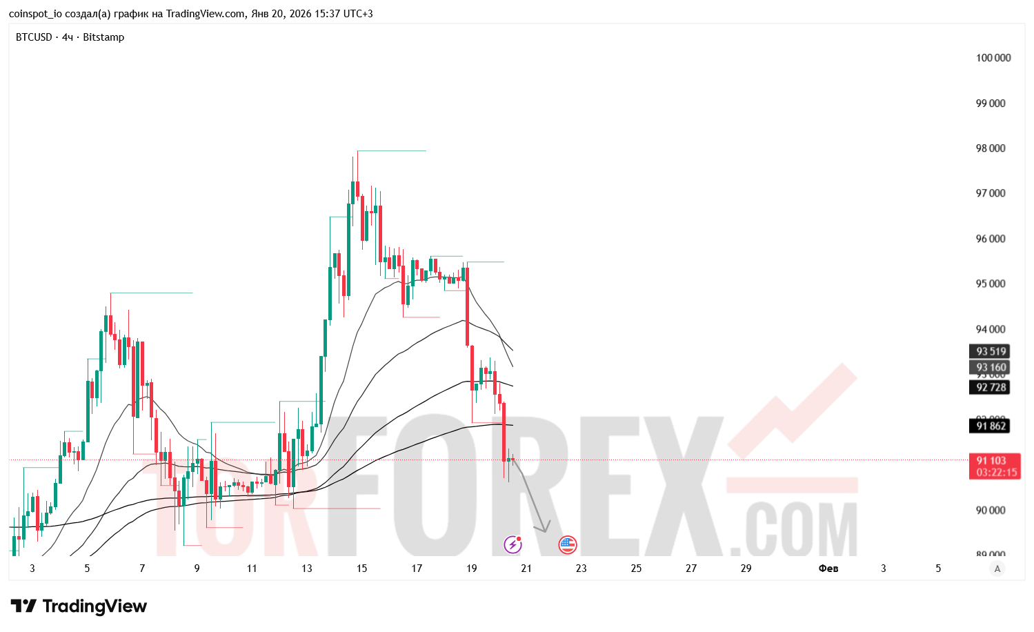 На 21 января 2026 года BTC/USD сохраняет медвежью структуру с признаками ускоренной коррекции. Основной сценарий — снижение к 90 200–89 500 USD при пробое зоны поддержки. Альтернативный сценарий — краткосрочная коррекция к 92 500–93 000 USD при отскоке от 90 800.