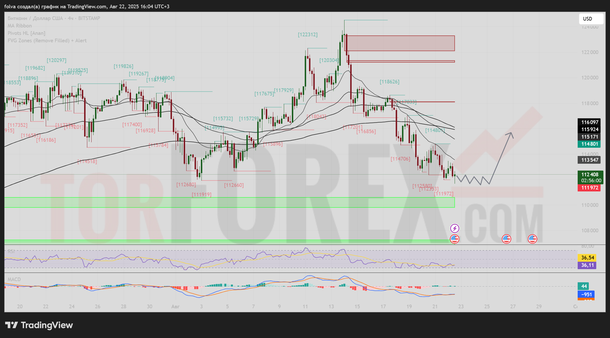 На 23 августа 2025 года торговая пара BTC/USD остаётся под давлением продавцов, однако локальные сигналы RSI и MACD указывают на вероятность технической коррекции. Основной диапазон торгов на завтра — $111 900–$116 000.
