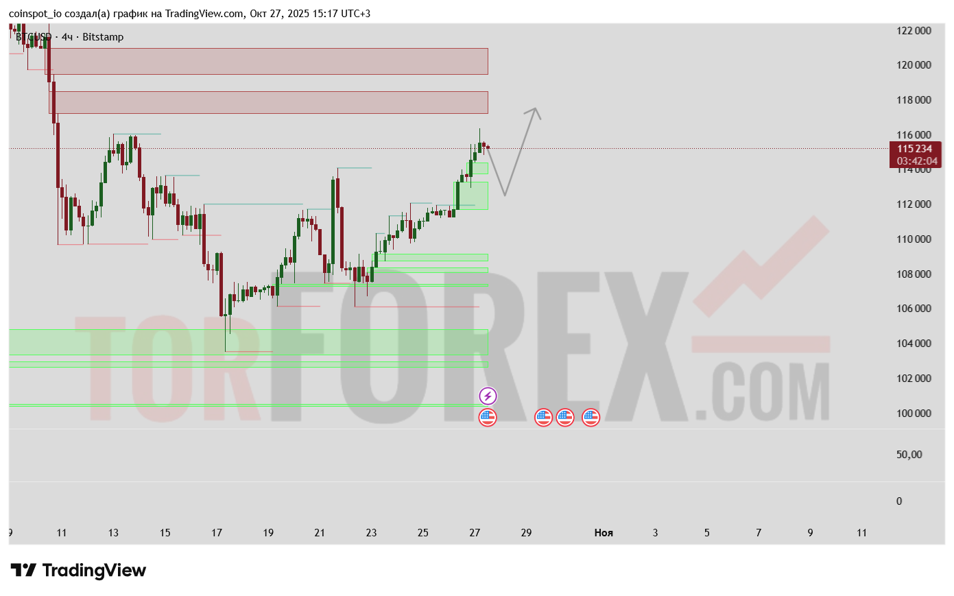 При сохранении текущего импульса и отсутствии дивергенций на RSI, наиболее вероятным сценарием является движение цены в зону 116 000 – 120 000 USD, где расположена ключевая FVG-зона. Здесь возможно частичное снятие ликвидности и начало локальной коррекции.