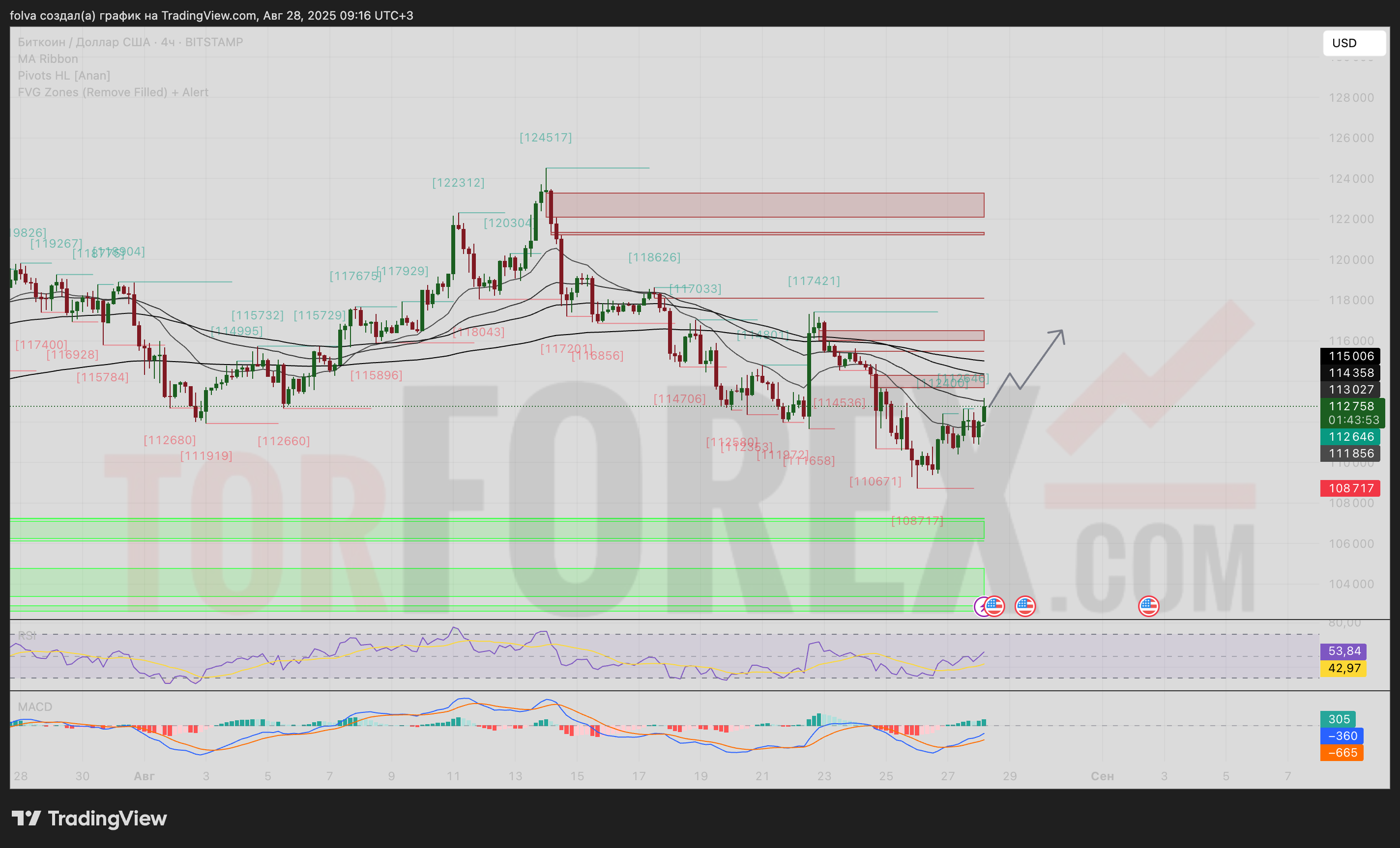 FVG-зоны располагаются в широком диапазоне $108,000-115,000, представляя критическую область поддержки при возобновлении снижения. Ключевое сопротивление формируется на уровнях $122,000-124,000, где ранее цена демонстрировала значительные продажи.