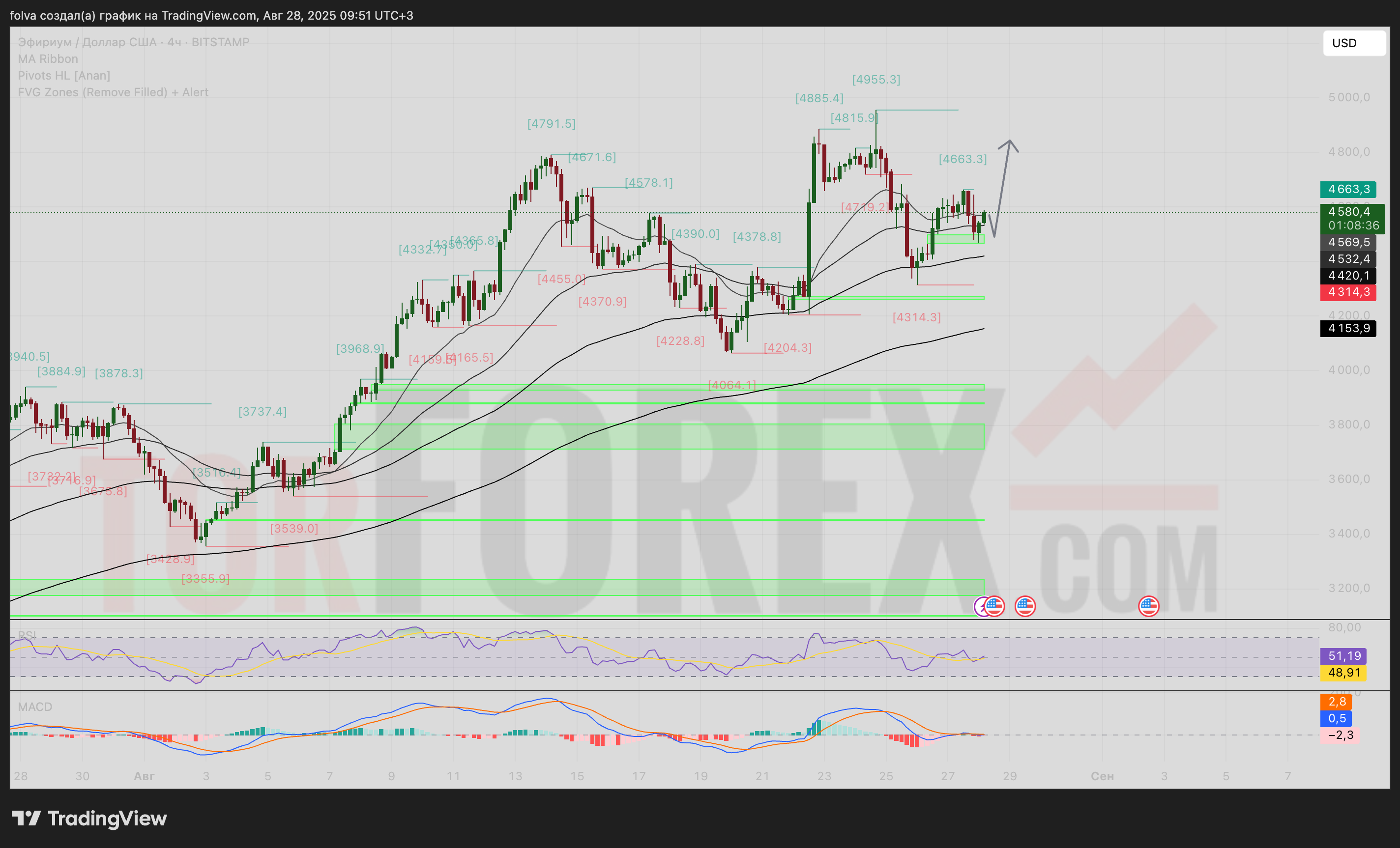 Торговая пара ETH/USD демонстрирует консолидационное движение в районе отметки 4600 долларов после достижения локального максимума на уровне 4885,4 доллара 22 августа. Текущая цена Ethereum составляет $4,577.23, что указывает на коррекционное давление после значительного роста в августе. Технический анализ четырехчасового графика позволяет определить ключевые направления для торговой сессии 29 августа.