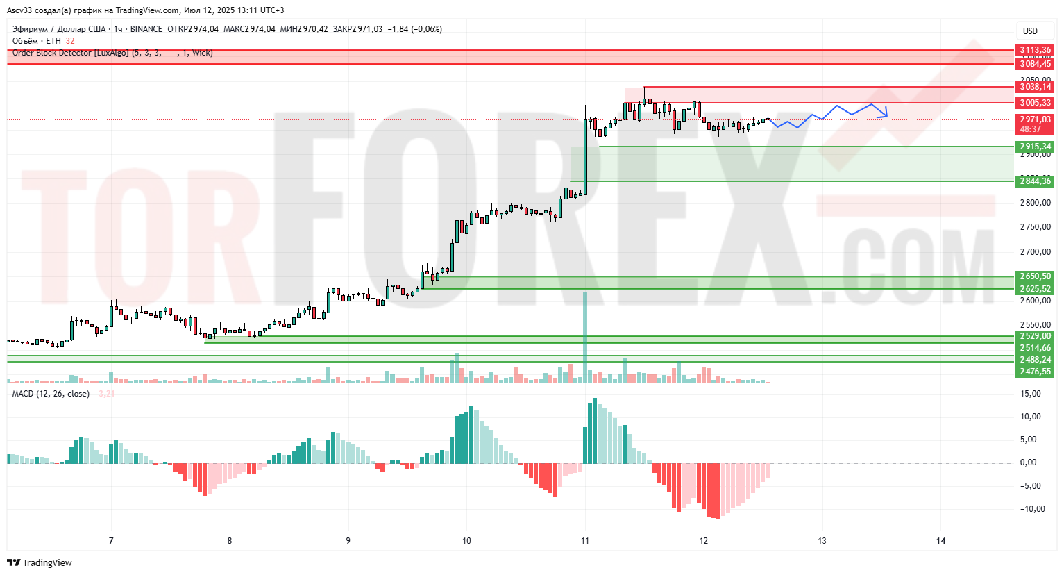 Ожидается движение в диапазоне 2915–3000 с попытками пробоя сопротивления. Однако при неспособности преодолеть 3005–3038 возможен откат к 2915 и ниже. Сценарий — нейтрально-медвежий.