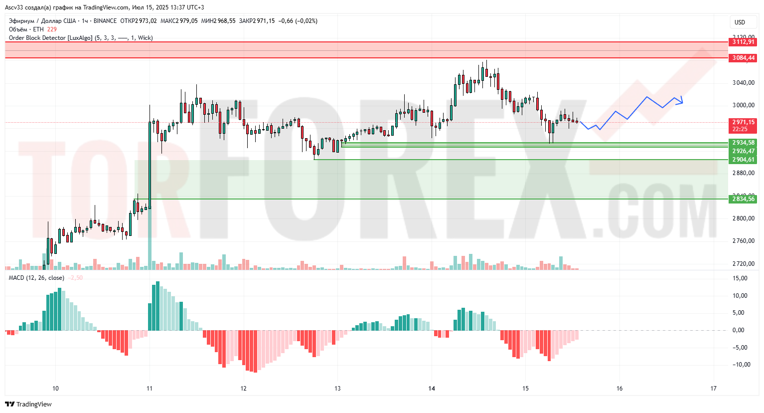 Ожидается движение ETH/USD в восходящем канале с целью повторного теста сопротивления в районе 3 005–3 080. При уверенном пробое этого диапазона откроется путь к 3 110. Потеря уровня 2 934 усилит давление и может привести к снижению в зону 2 835.