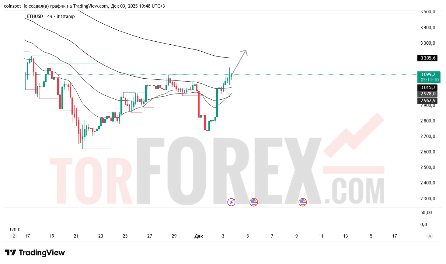 На 4 декабря 2025 года ETH/USD демонстрирует признаки устойчивого восстановления. Основной сценарий — движение к 3 180–3 250 USD при пробое 3 135 USD. Альтернативный сценарий — снижение к 2 960–2 910 USD при отказе от сопротивления.