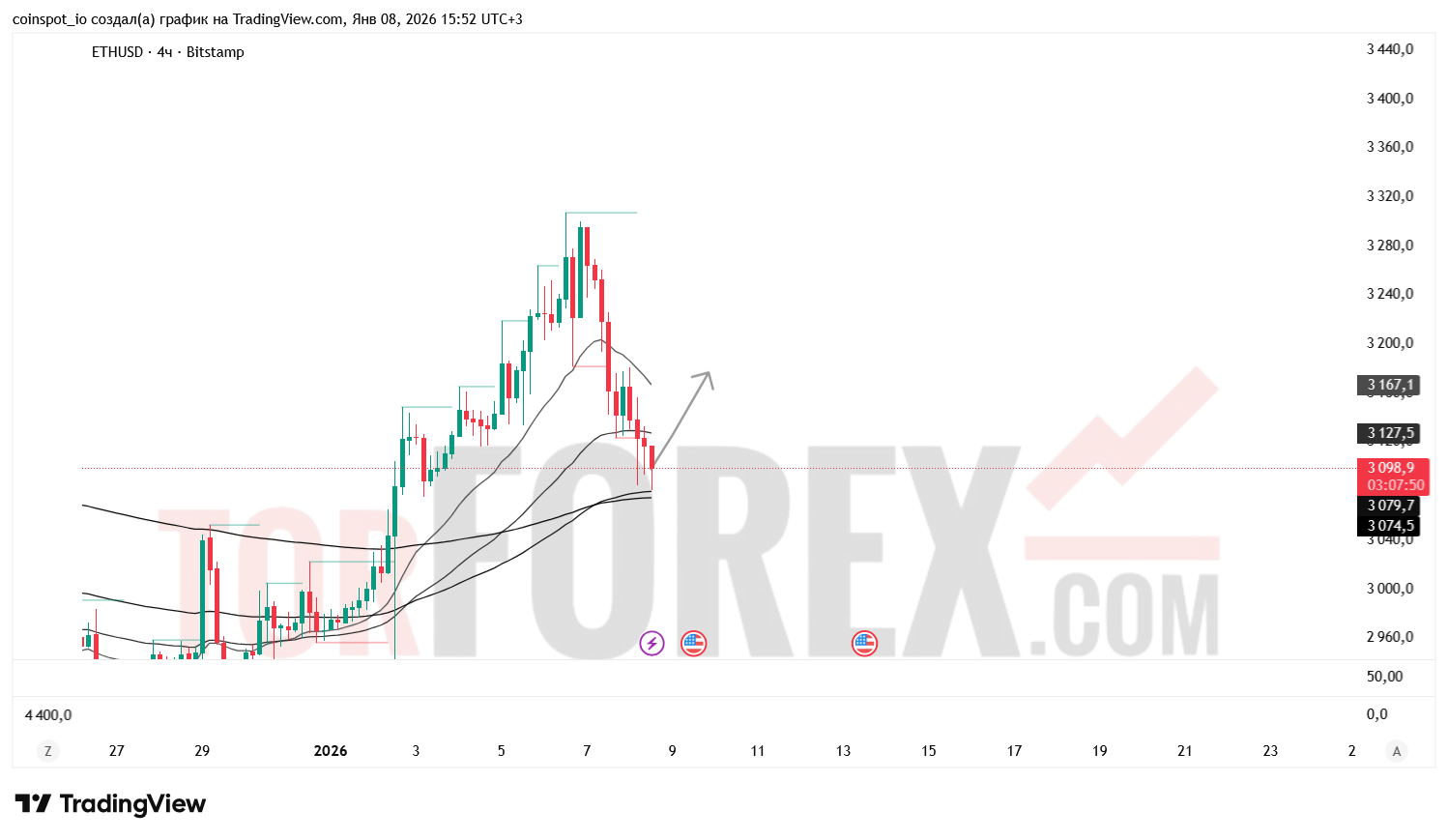 На 9 января 2026 года ETH/USD сохраняет нейтрально-медвежью структуру с признаками углубления коррекции. Основной сценарий — восстановление к 3 150–3 230 USD при пробое зоны сопротивления. Альтернативный сценарий — откат к 3 060–3 030 USD при отказе от уровня 3 096 USD.