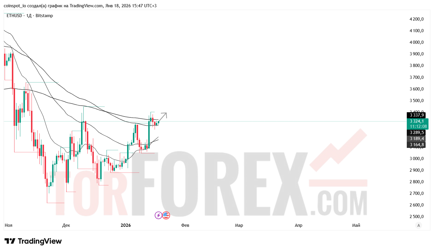 На неделю 18–25 января 2026 года ETH/USD сохраняет нейтрально-бычью структуру с признаками консолидации. Основной сценарий — восстановление к 3 390–3 420 USD при пробое зоны сопротивления. Альтернативный сценарий — откат к 3 280–3 250 USD при отказе от уровня 3 324.10.