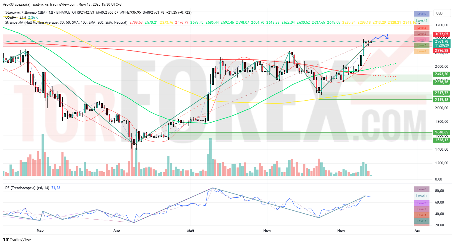 Отказ от пробоя $3 000 может привести к откату в область $2 890–$2 850. В случае углубления — тест зон $2 570 и $2 480, где проходят ключевые EMA и FVG.