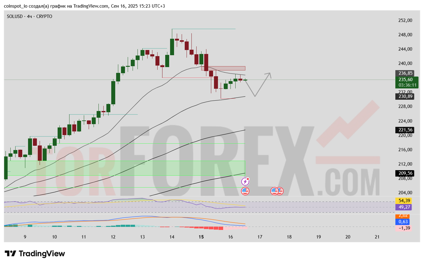 - Цена: На момент анализа (16 сентября 2025, 15:21 UTC+3) цена SOL/USD составляет примерно 235.76.