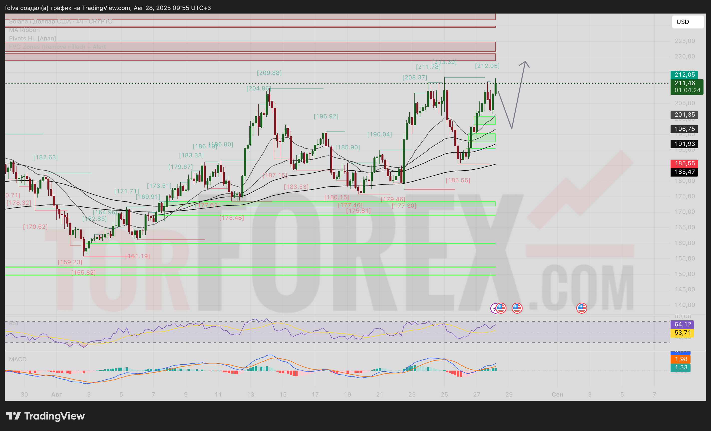 Базовый сценарий предполагает продолжение восходящего движения с целевыми уровнями в районе $220-225. Прорыв текущего сопротивления на $212 может активировать следующую волну роста к историческим максимумам около $240-250.