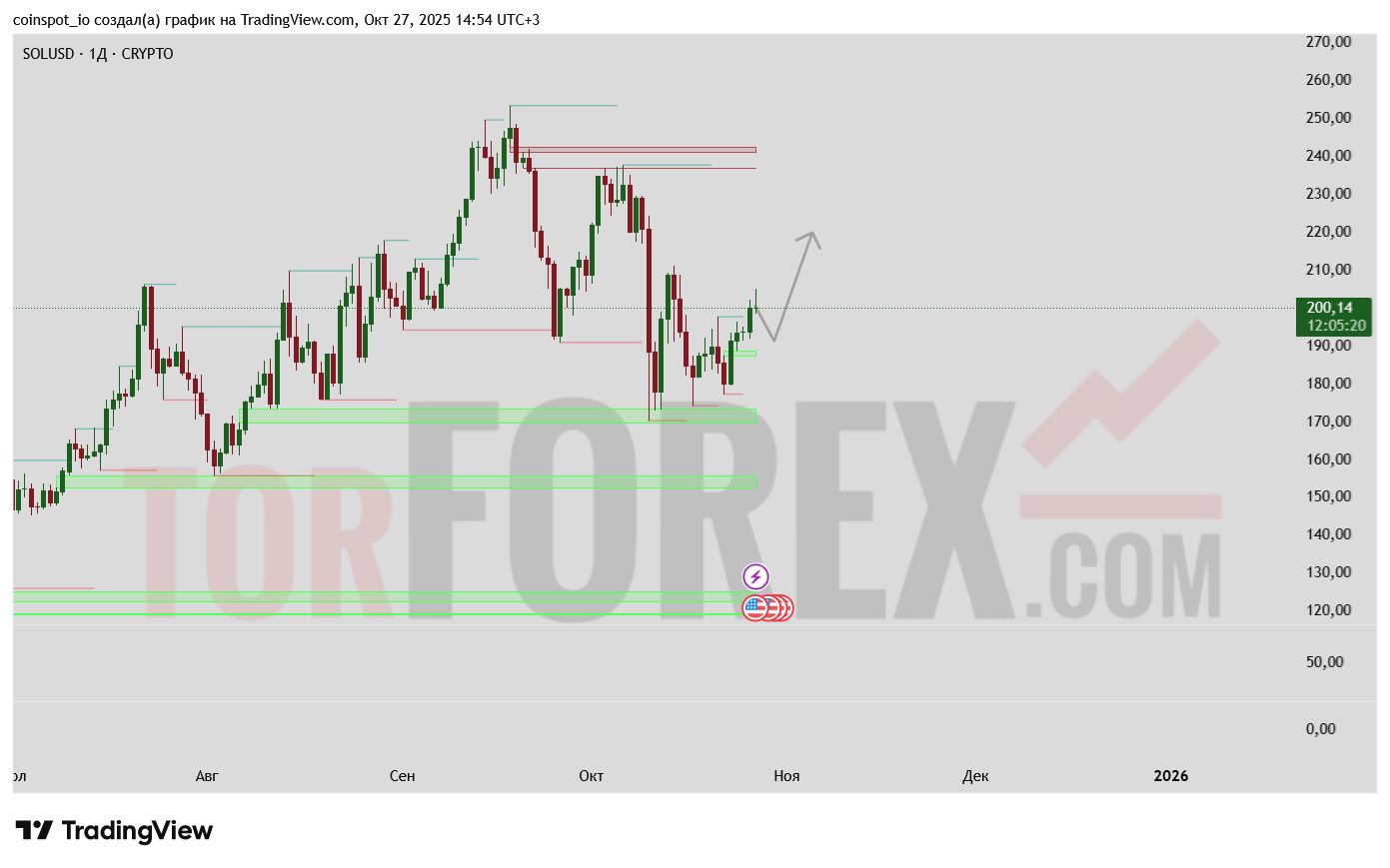 Бычий сценарий: Реализуется при удержании цены выше уровня 200,00 USD и последующем преодолении сопротивления 220,00 USD. Это активирует более масштабный рост с первой целью в районе 250,00 USD. Подтверждением послужит пробой и закрепление выше скользящих средних.