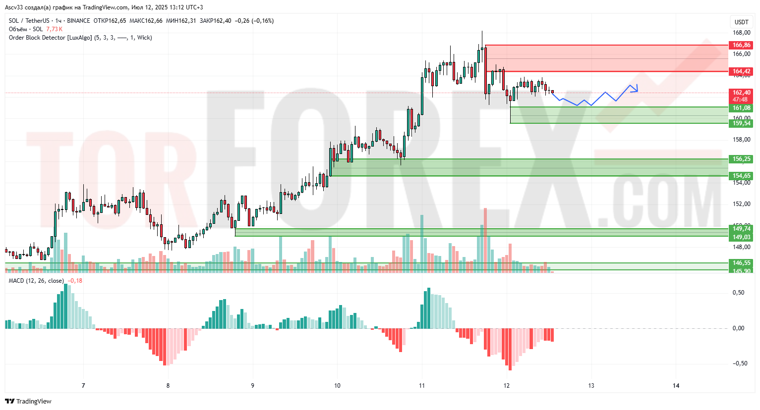 SOL/USD корректируется после теста зоны предложения 164.42–166.86. Цена отскочила от сопротивления и консолидируется в узком диапазоне на фоне снижения объёмов. Локальная поддержка формируется в районе 161.08–159.54, где ранее была активность покупателей. Пока структура остаётся восходящей, но импульс замедляется.
