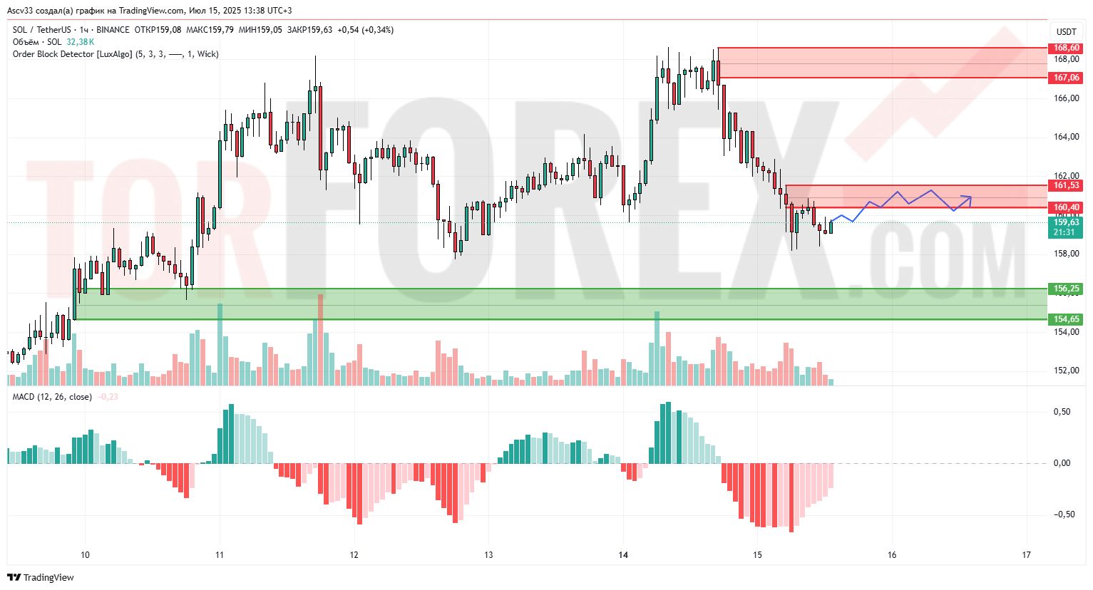 Ожидается движение SOL/USD в рамках бокового диапазона с поддержкой у 159 и сопротивлением вблизи 161,5. При пробое вверх можно ожидать рост к 167. При откате ниже 156 возможна новая волна снижения.