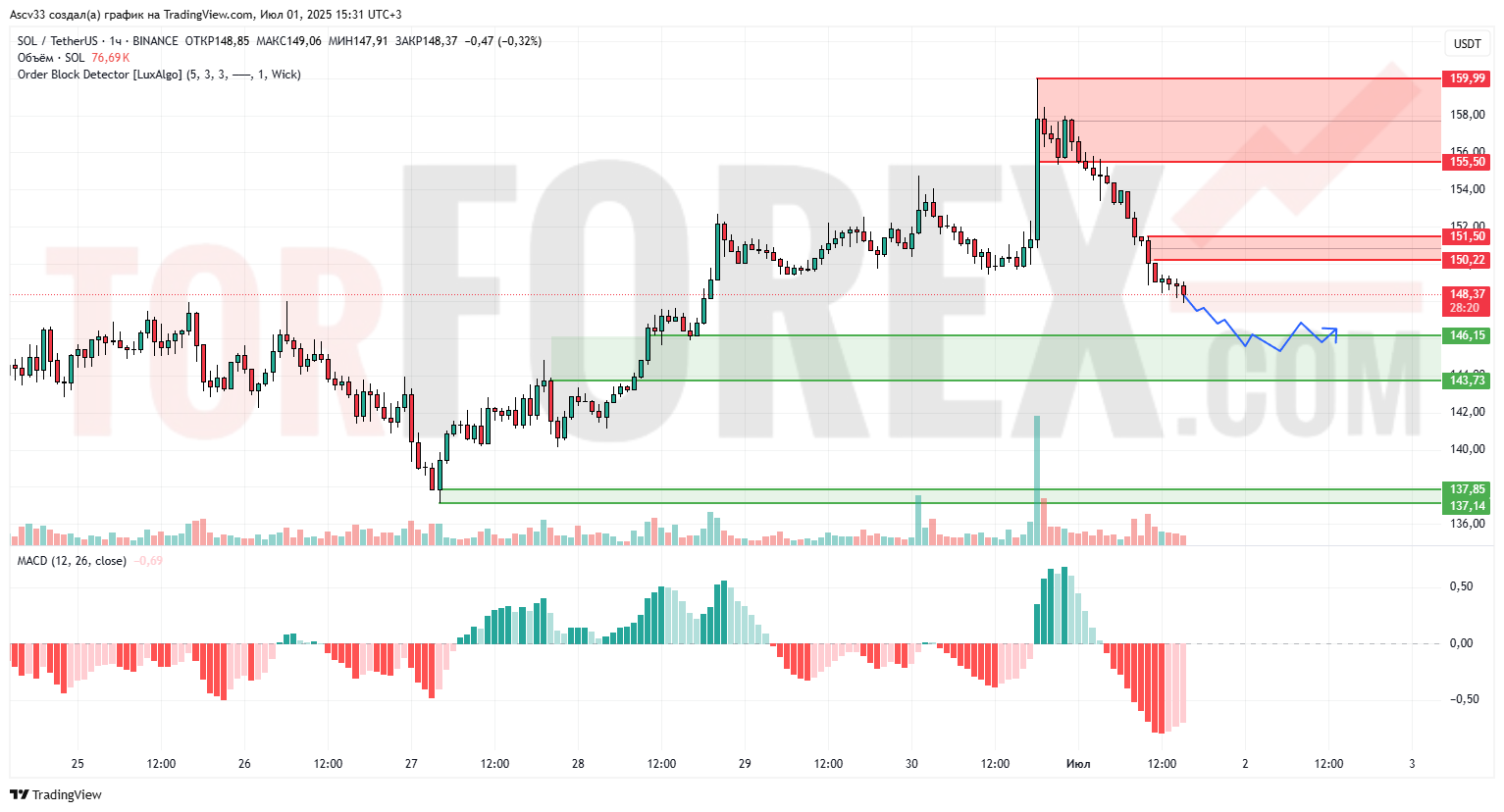 SOL/USD, вероятно, протестирует уровень 146 с возможной краткосрочной стабилизацией в диапазоне 146–150. При удержании текущей зоны спроса возможен отскок. В случае пробоя вниз следующая цель — область 143,7 и затем 137,1.
