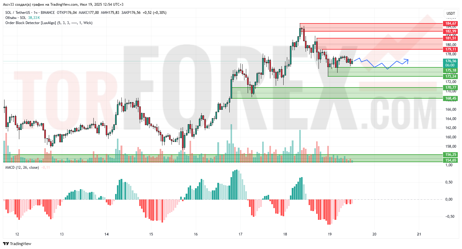Ожидается движение в боковом диапазоне 173–179 с возможностью выхода вверх при пробое уровня 179,1. При возврате под 173 высока вероятность снижения к 170. Общая структура остаётся нейтрально-бычьей.
