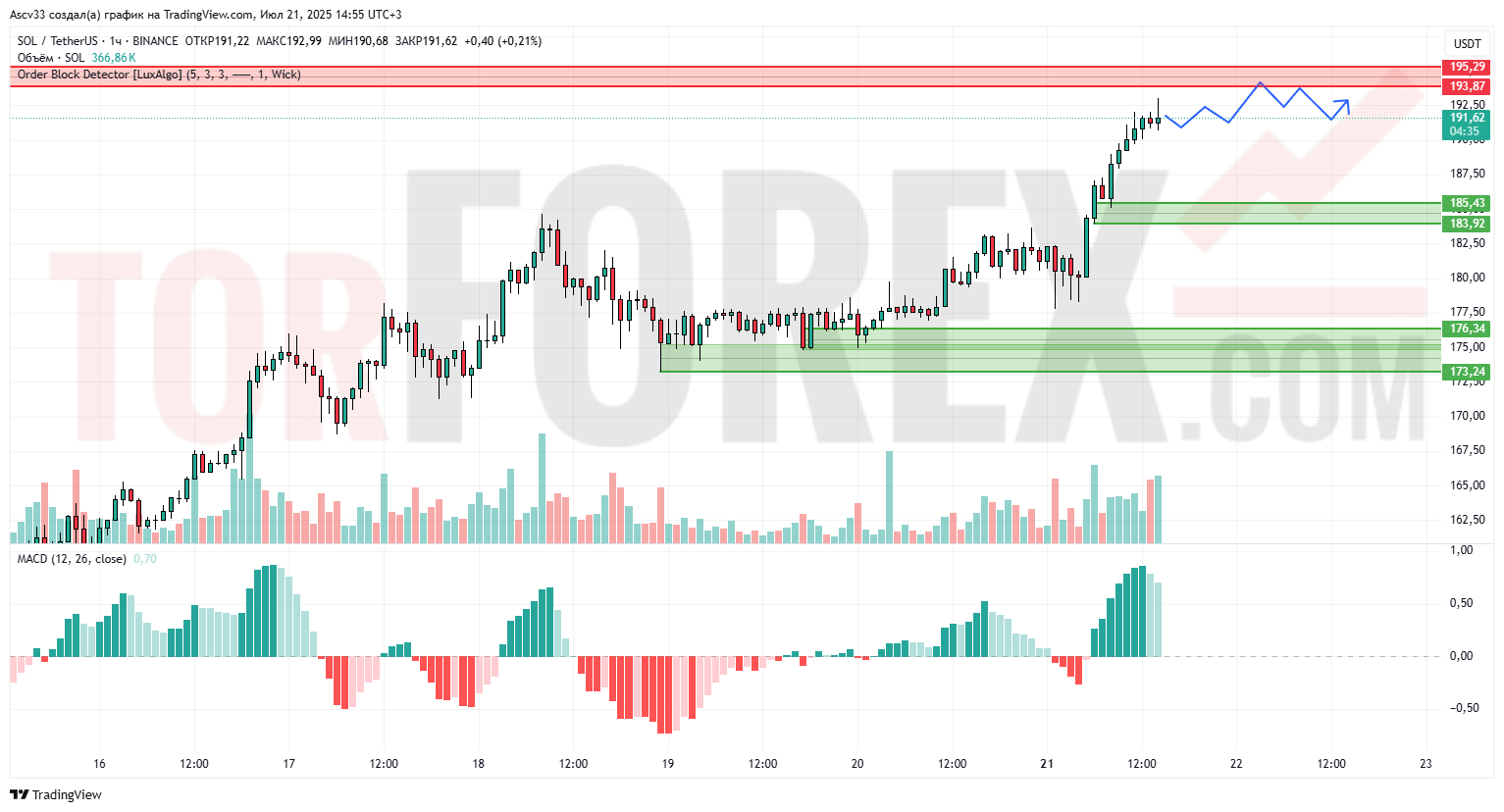 SOL/USDT вероятно войдёт в фазу консолидации вблизи сопротивления 193–195 с возможными попытками пробоя. В случае отката, поддержка на 185 может выступить как точка для продолжения роста. Общий тренд остаётся восходящим при условии удержания выше 183.