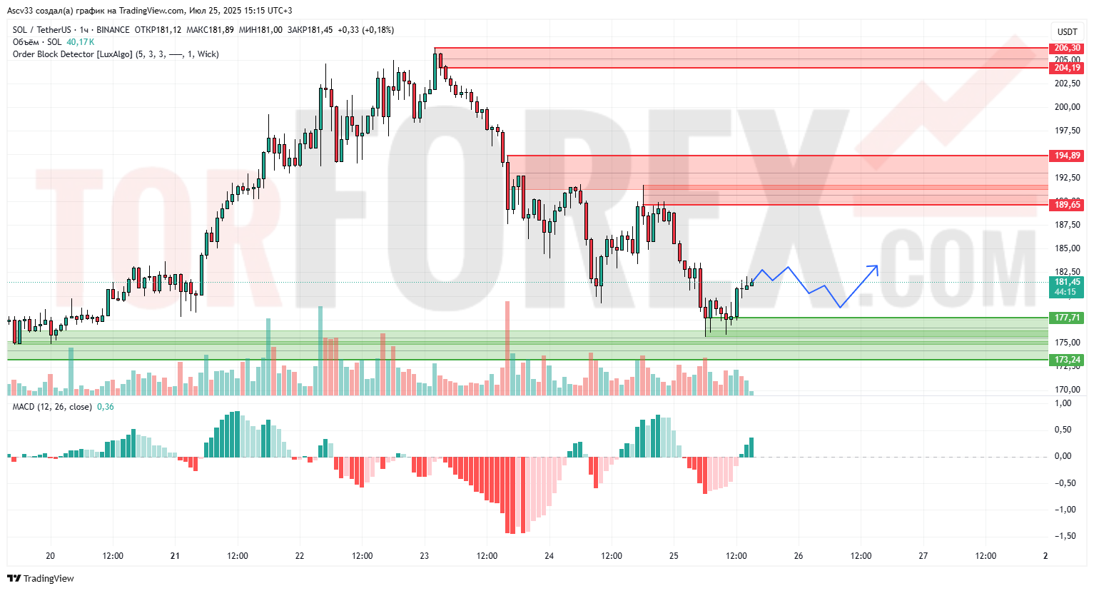 При удержании выше зоны поддержки 177.71 – 173.24, пара SOL/USD может продолжить восстановление в направлении 189.65. Успешный пробой этого уровня откроет путь к 192.50 – 194.89. Однако, пока нет подтвержденного пробоя значимых сопротивлений, сохраняется риск дальнейшей консолидации или возобновления нисходящего движения. Основной сценарий — попытка коррекционного роста с последующей борьбой за удержание ключевых уровней.