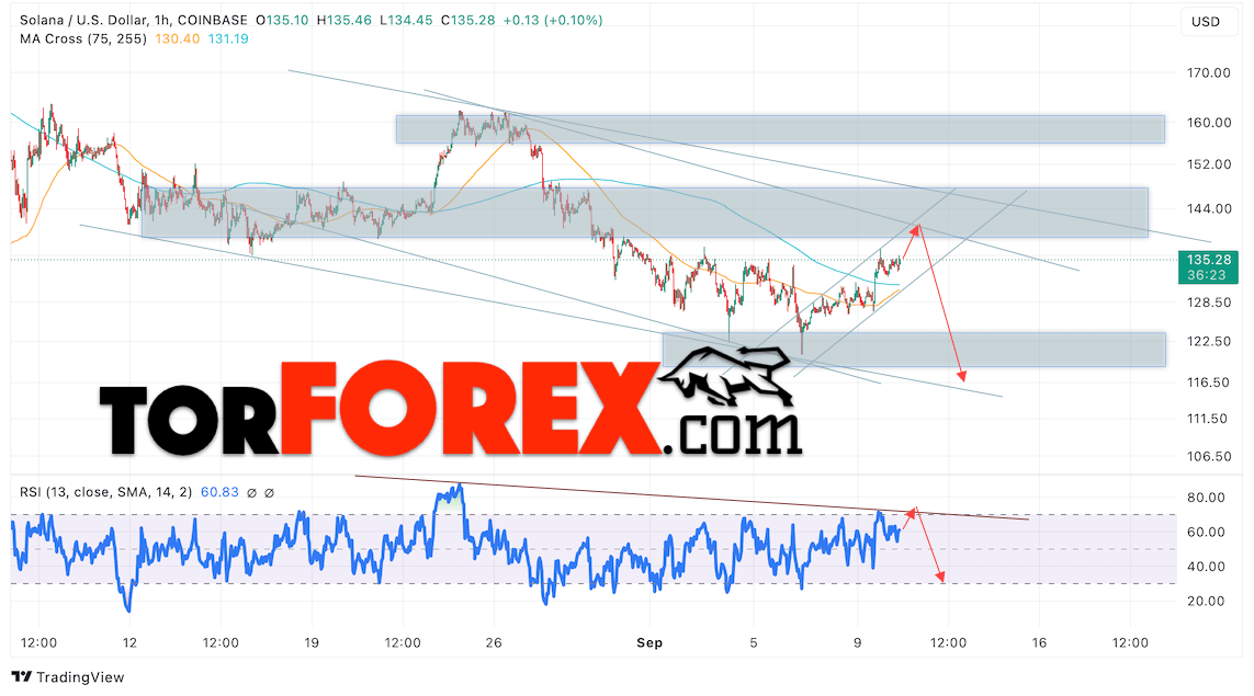 Котировки SOL/USD торгуются вблизи отметки 135.28 в рамках роста и нисходящего канала. Скользящие средние указывают на наличие краткосрочной медвежьей тенденции по Solana. Цены пробили область между сигнальными линиями вверх, что указывает на давление со стороны покупателей актива и потенциальное продолжение роста цены уже с текущих уровней. В рамках прогноза курса Solana на сегодня стоит рассматривать попытку развития подъёма стоимости цифрового актива и тест уровня сопротивления 140.05. Откуда вновь стоит рассматривать отбой цены вниз и попытку продолжения падения курса Solana с целью ниже области 115.05.