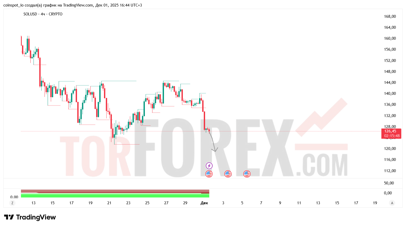 На 2 декабря 2025 года SOL/USD демонстрирует признаки разворота вниз. Основной сценарий — снижение к 122.00–119.00 USD при пробое 123.00 USD. Альтернативный сценарий — восстановление к 130.50–133.00 USD при удержании поддержки и росте RSI.