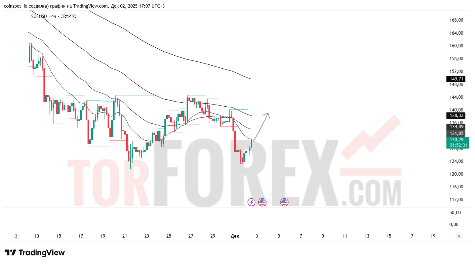 На 3 декабря 2025 года SOL/USD демонстрирует признаки коррекционного восстановления. Основной сценарий — движение к 136.00–138.50 USD при пробое 133.00 USD. Альтернативный сценарий — снижение к 123.50–121.00 USD при отказе от сопротивления.
