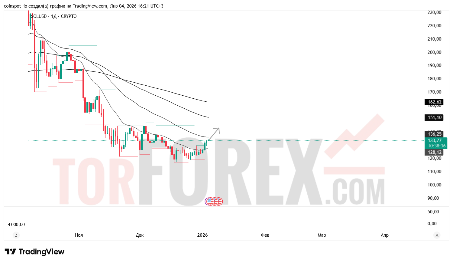 На неделе 04–11 января 2026 года SOL/USD сохраняет нейтрально-бычью структуру с признаками устойчивого восстановления. Основной сценарий — рост к 137.00–142.00 USD при пробое зоны сопротивления. Альтернативный сценарий — откат к 130.50–128.00 USD при отказе от уровня 133.95 USD.
