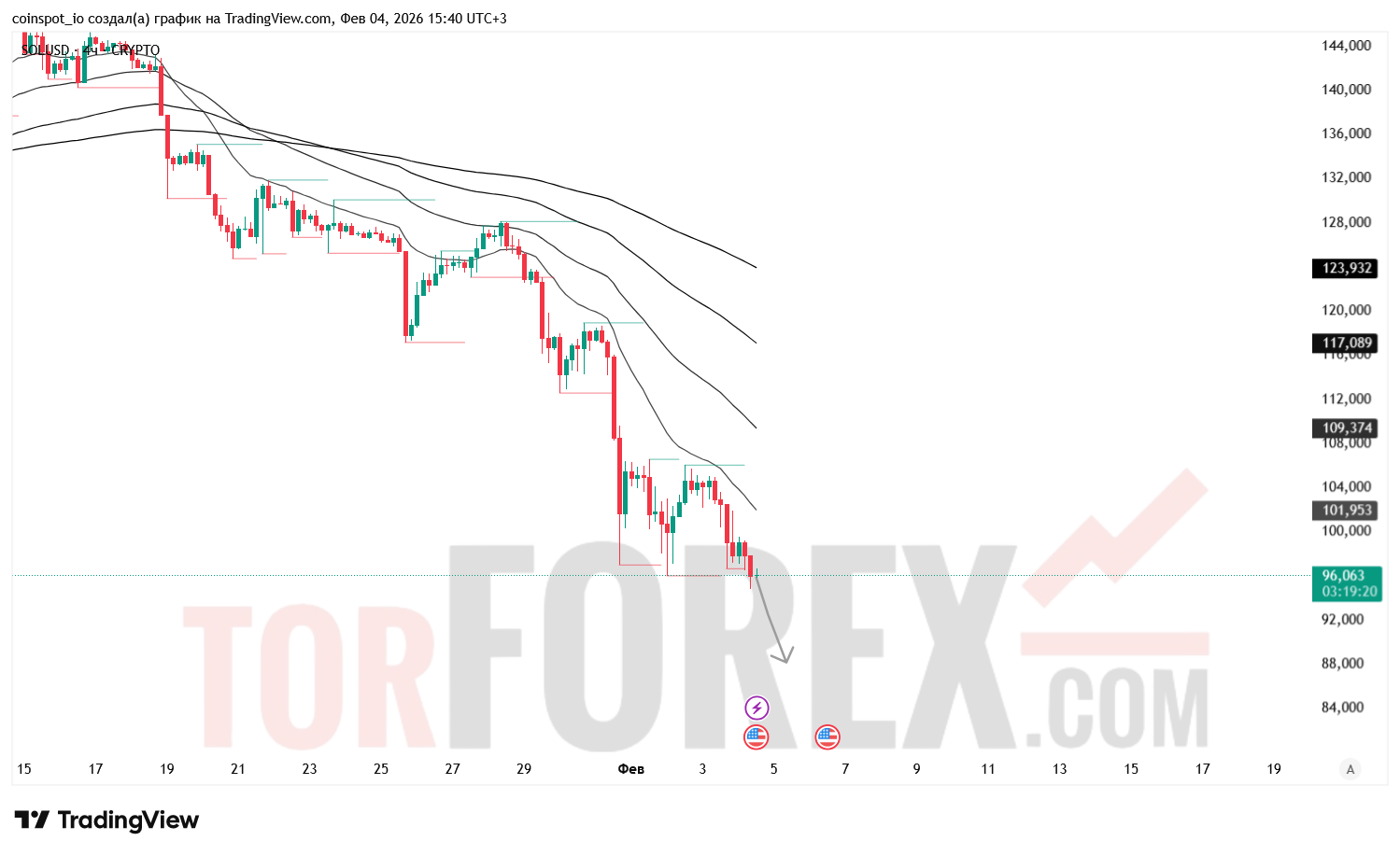К началу торгового дня 5 февраля 2026 года пара SOL/USD остаётся под выраженным давлением продавцов. На 4‑часовом графике цена опускается в область 95–96 USD, обновляя локальные минимумы и формируя устойчивый нисходящий импульс. Динамика последних свечей указывает на усиление медвежьего давления, а попытки восстановления выглядят краткосрочными и не меняют общей структуры рынка. Волатильность остаётся повышенной, что усиливает вероятность резких импульсов в обе стороны.